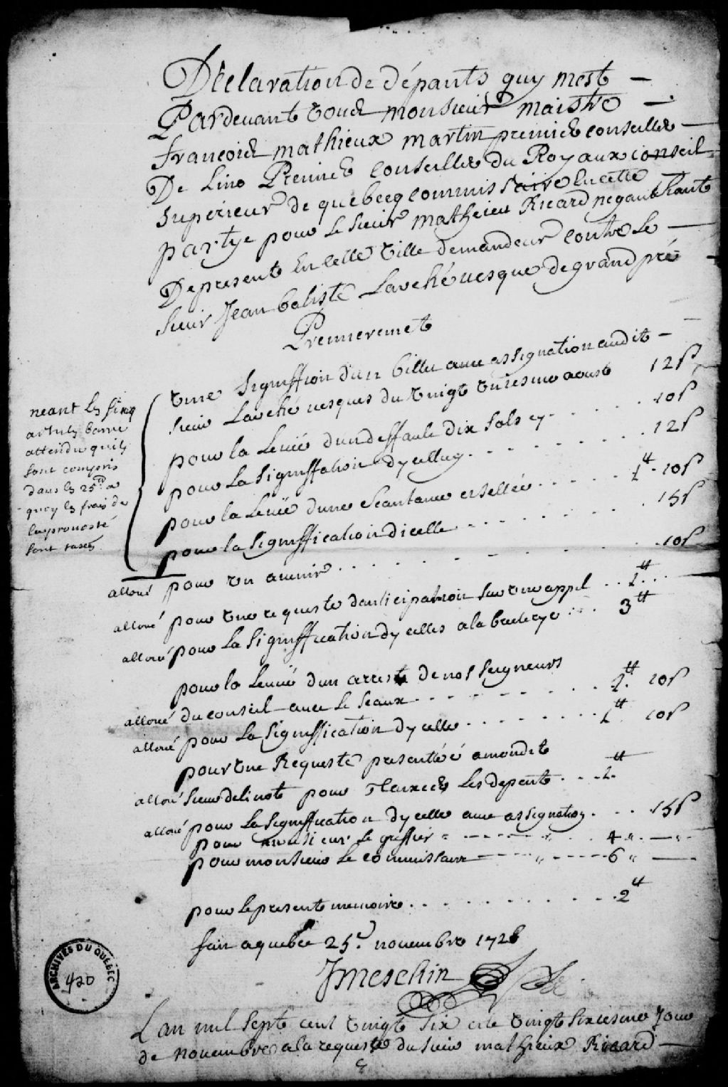 Mémoire des dépens à payer par Jean Larchevêque Grandpré, à la requête de Mathieu Ricard, négociant de Québec, à la suite de l'arrêt du Conseil supérieur de Québec du 18 novembre 1726
