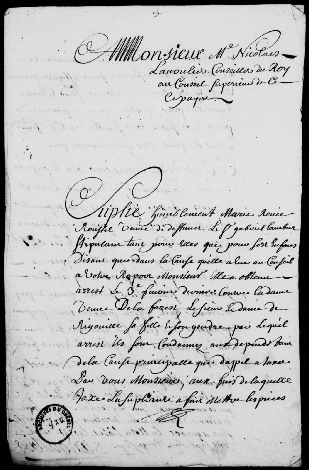 - Mémoire des dépens à payer par Françoise-Charlotte Juchereau, veuve en premières noces de François Vienney Pachot (Viennay) et en secondes noces de François de Laforest, et Nicolas Blaise des Bergères de Rigauville, son gendre, à la requête de Marie-Renée Roussel, veuve de Gabriel Lambert, à la suite de l'arrêt du Conseil supérieur de Québec du 3 février 1727