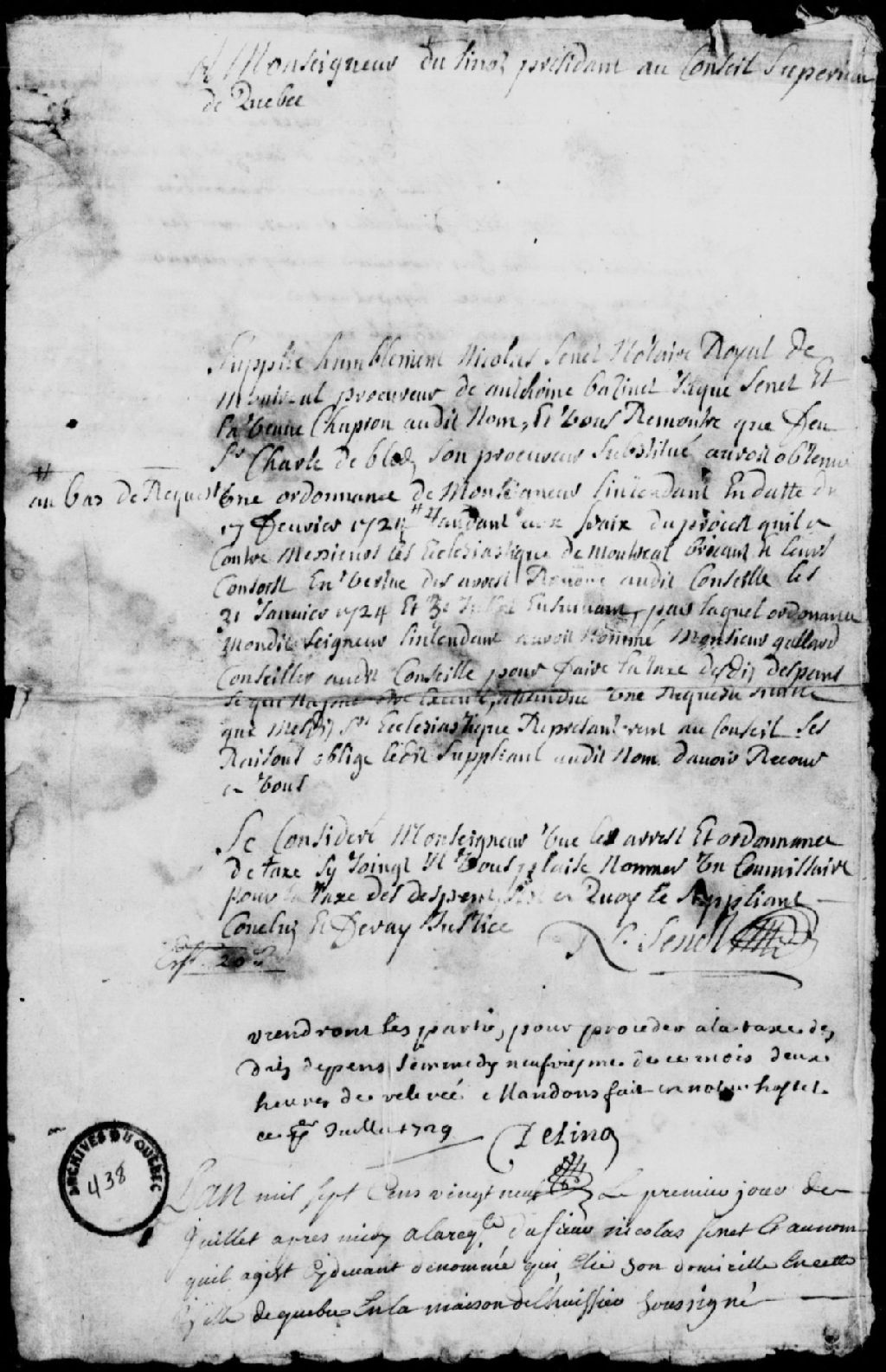 - Requête de Jacques Senet, Antoine Bazinet et Cécile Carrière, veuve de Jacques Chaperon, contre les Ecclésiastiques du Séminaire de Montréal, à la suite des arrêts du Conseil supérieur de Québec des 31 janvier 1724 et 31 juillet 1724