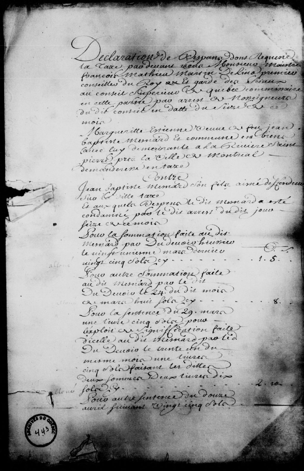 Mémoire des dépens à payer par Jean-Baptiste Ménard, fils aîné, à Marguerite Étienne, veuve de Jean-Baptiste Ménard, et commune en biens avec lui, de la rivière Saint-Pierre, près de Montréal, à la suite de l'arrêt du Conseil supérieur de Québec du 16 janvier 1730