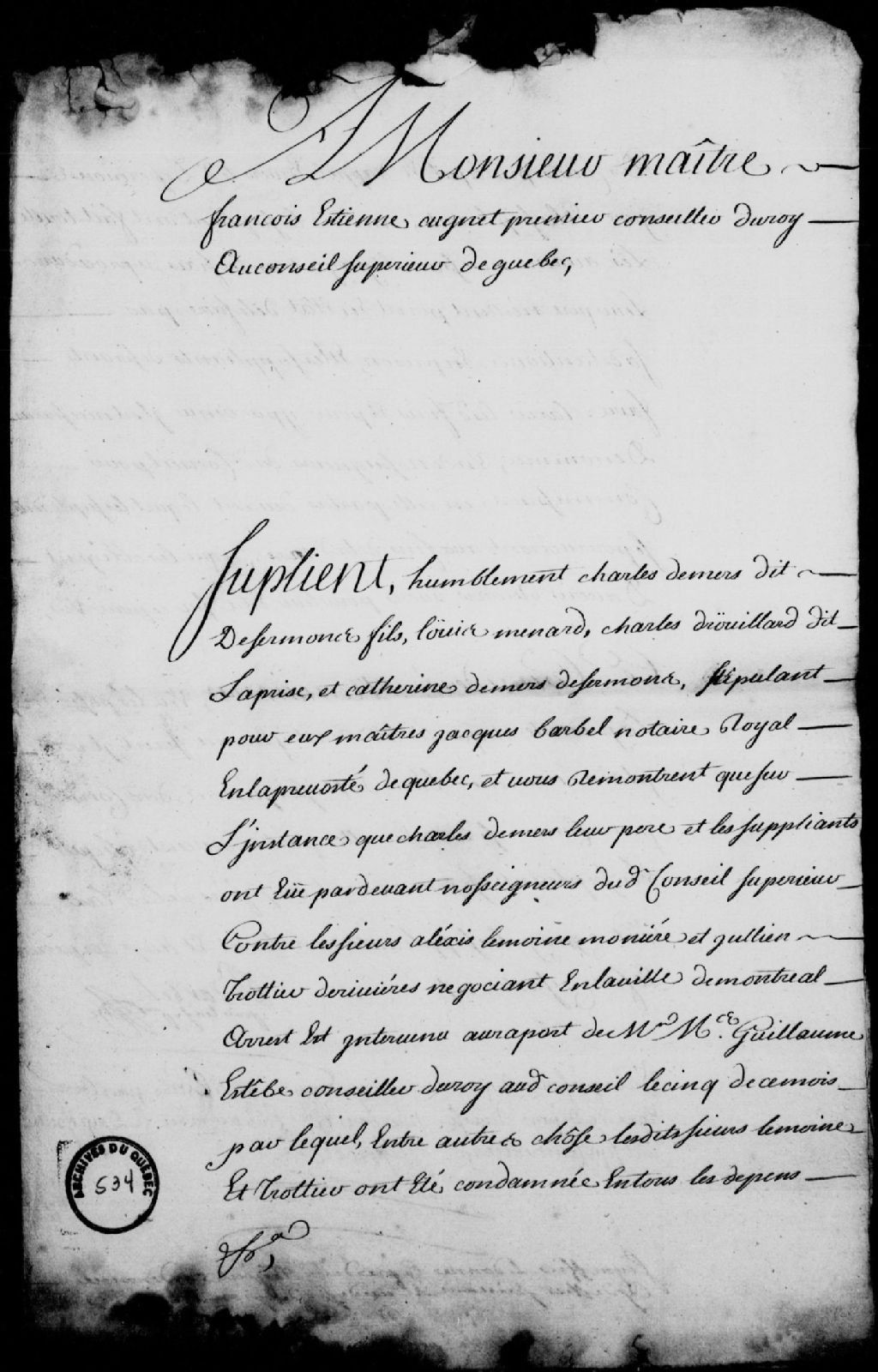- Mémoire des dépens à payer par les sieurs Alexis Lemoine Monière et Julien Trottier DesRivières, marchands de Montréal, à la requête de Charles Demers dit Dessermons fils, Louis Ménard, Charles Drouillard dit Laprise (Douillard) et Catherine Demers Dessermons, à la suite de l'arrêt du Conseil supérieur de Québec du 5 juillet 1737