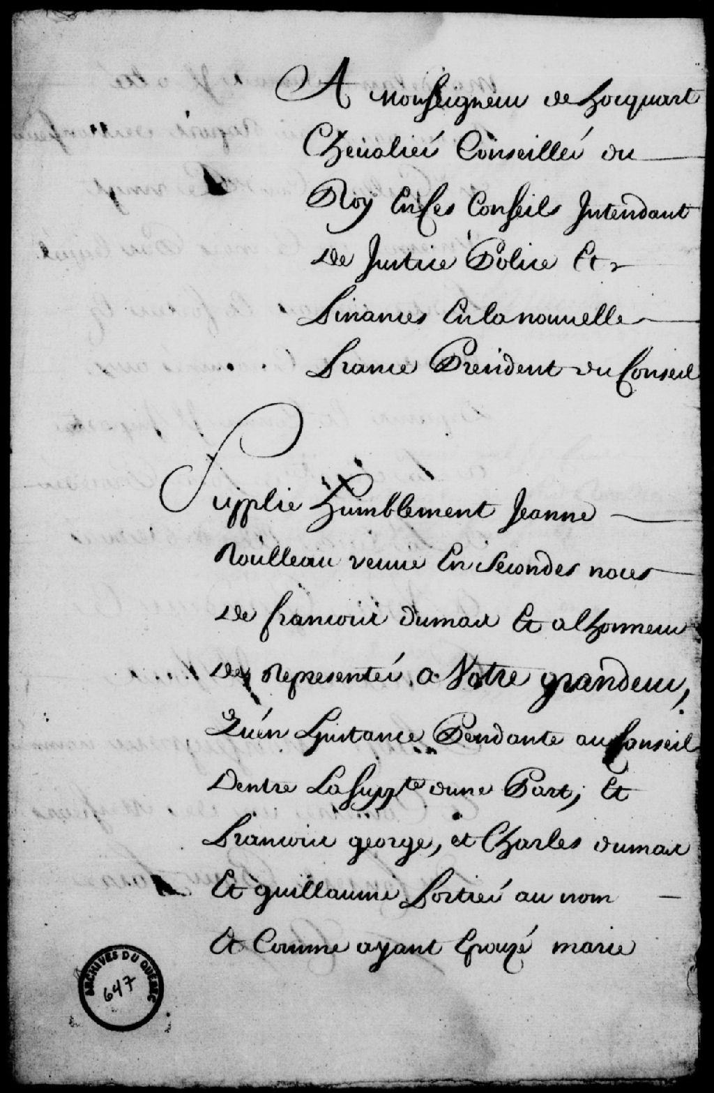 - Mémoire des dépens à payer par François Dumas, Georges Dumas et Charles Dumas, frères, et Guillaume Fortier, leur beau-frère, au nom et comme époux de Marie-Madeleine Dumas, tous habitants de l'île et comté de Saint-Laurent (île d'Orléans), à la requête de Jeanne Rouleau, veuve en secondes noces de François Dumas, à la suite de l'arrêt du Conseil supérieur de Québec du 21 mars 1739