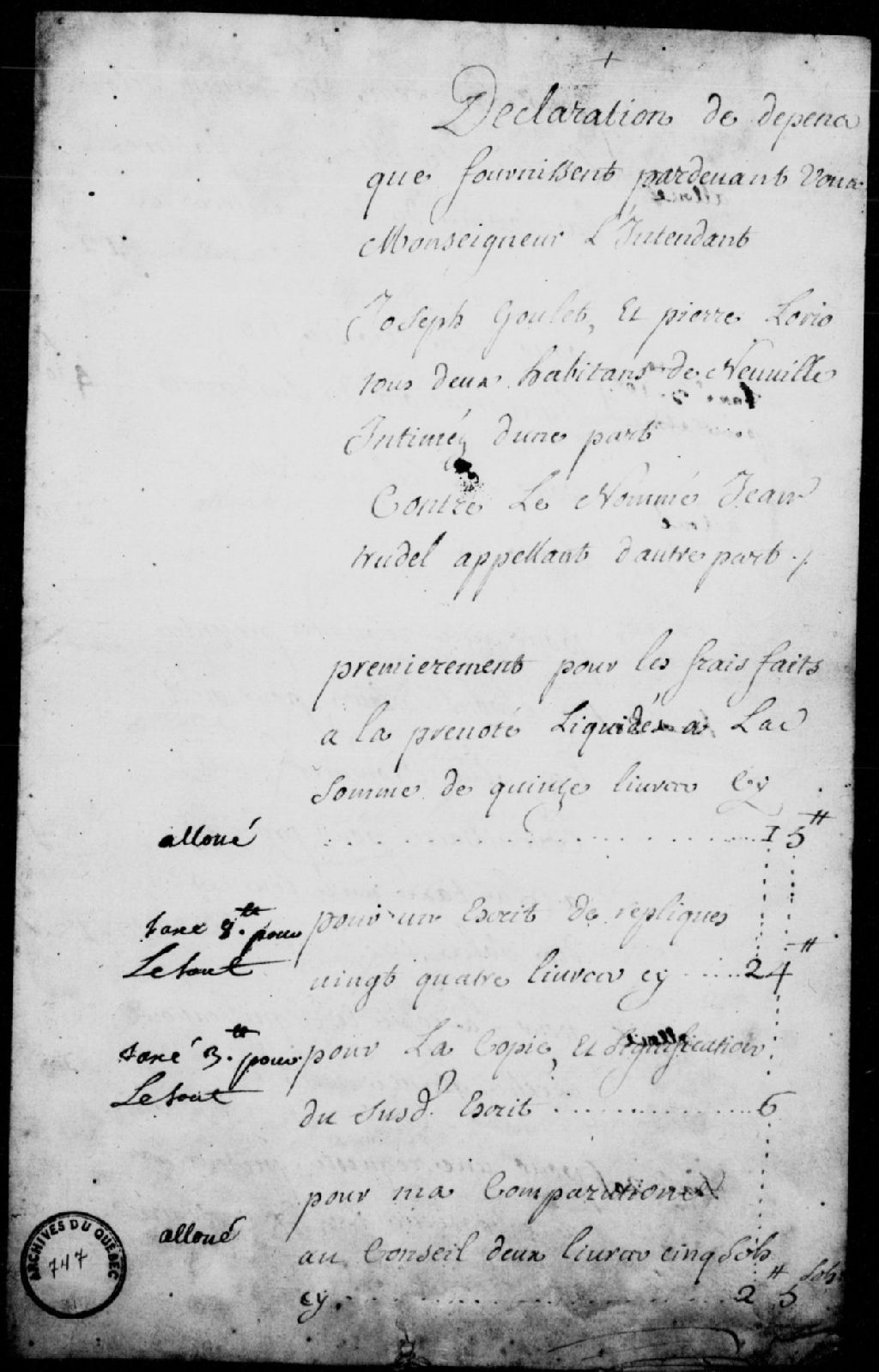 - Mémoire des dépens à payer par Jean Trudel, fermier des sieurs du Séminaire de Saint-Sulpice, établi à Montréal, tuteur des enfants mineurs de feu Nicolas Mathieu et d'Angélique Bélanger, à la requête de Joseph Goulet et Pierre Lorin (Lorrain), habitants de Neuville, à la suite de l'arrêt du Conseil supérieur de Québec du 16 juillet 1742