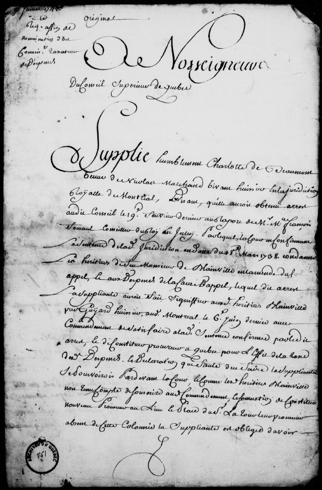 - Mémoire des dépens à payer par Pierre-Joseph Céloron de Blainville, capitaine dans les troupes de la Marine, et Jean-Baptiste Céloron, aussi officier dans lesdites troupes, à la requête de Charlotte de Beaumont, veuve de Nicolas Marchand, huissier à Montréal, à la suite de l'arrêt du Conseil supérieur de Québec du 19 février 1742