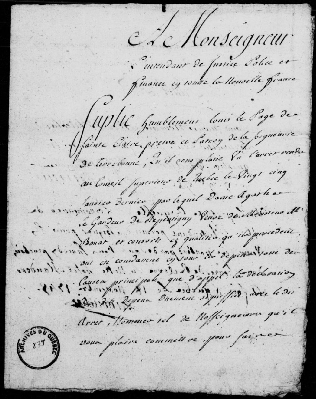 - Mémoire des dépens à payer par dame Agathe Legardeur de Repentigny (Le Gardeur), seconde épouse et veuve de François-Marie Bouat, et consorts, à la requête de Louis Lepage de Sainte-Claire, prêtre, seigneur et patron de la terre et seigneurie de Terrebonne, à la suite de l'arrêt du Conseil supérieur de Québec du 25 janvier 1745