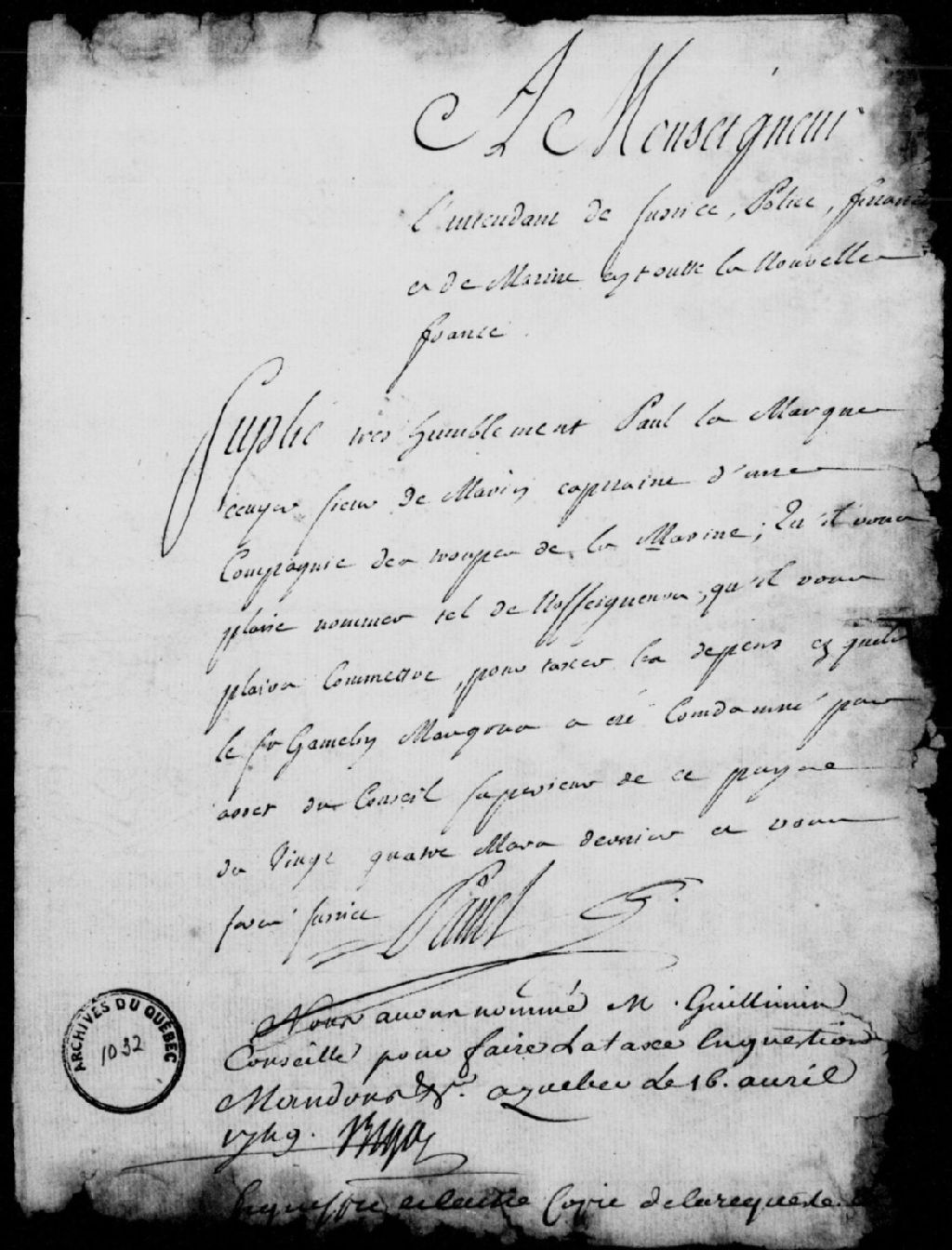 - Mémoire des dépens à payer par Pierre Gamelin Maugras, négociant de Montréal, à la requête de Paul Lamarque (Lamargue), sieur de Marin, capitaine dans les troupes de la Marine, à la suite de l'arrêt du Conseil supérieur de Québec du 24 mars 1749