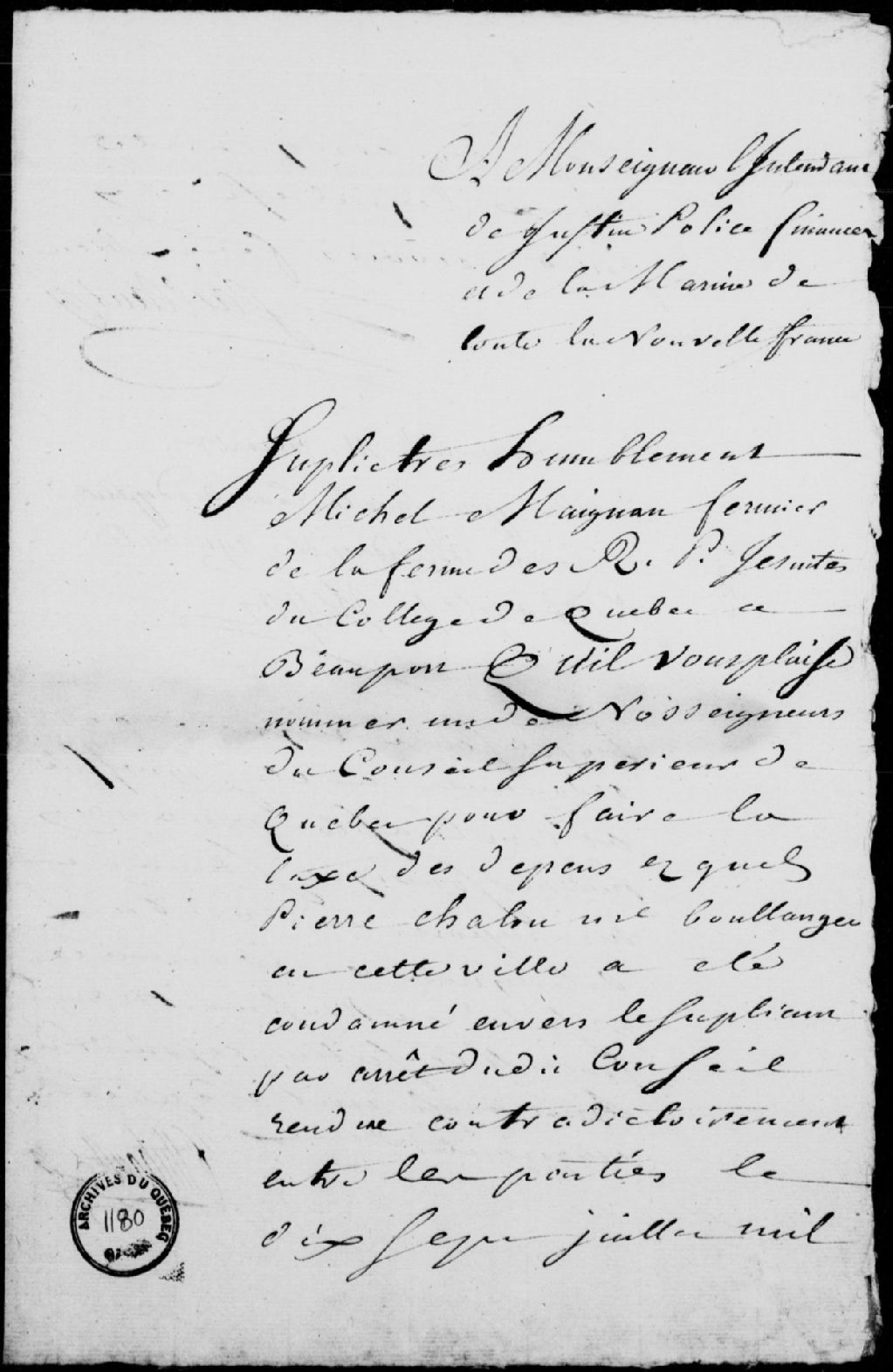 - Mémoire des dépens à payer par Pierre Chalou (Chaloult), boulanger de Québec, à la requête de Michel Magnan, fermier de la ferme des Pères Jésuites du Collège de Québec, à la suite de l'arrêt du Conseil supérieur de Québec du 17 juillet 1752