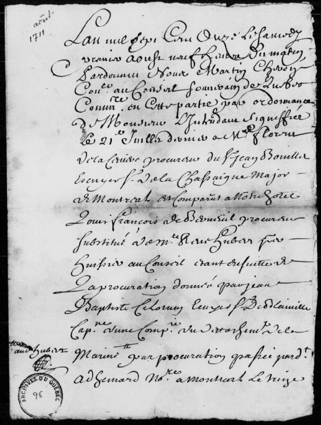 - Requête de Jean-Baptiste Celoron, écuyer, sieur de Blainville et capitaine des troupes du détachement de la Marine, afin d'être payé pour son billet, contre Jean Bouillet, écuyer, sieur de La Chassaigne (LaChassaigne), major des ville et gouvernement de Montréal, qui en a appelé d'une sentence du 3 février 1711
