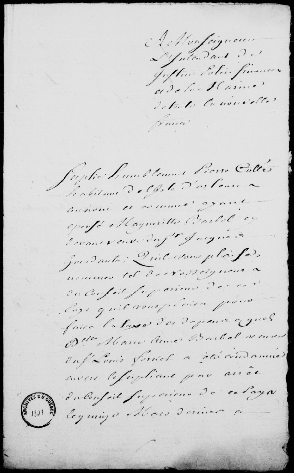 Mémoire des dépens à payer par Marie-Anne Barbel, veuve de Louis Fornel, à la requête de Pierre Côté, demeurant à l'île d'Orléans, au nom et comme époux de Marguerite Barbel, auparavant veuve de Jacques Gourdeau, à la suite des arrêts du Conseil supérieur de Québec des 19 janvier 1756 et 15 mars 1756, 5 avril 1756 - 10 avril 1756, Archives nationales à Québec, Fonds Conseil souverain, (03Q,TP1,S30,D373).