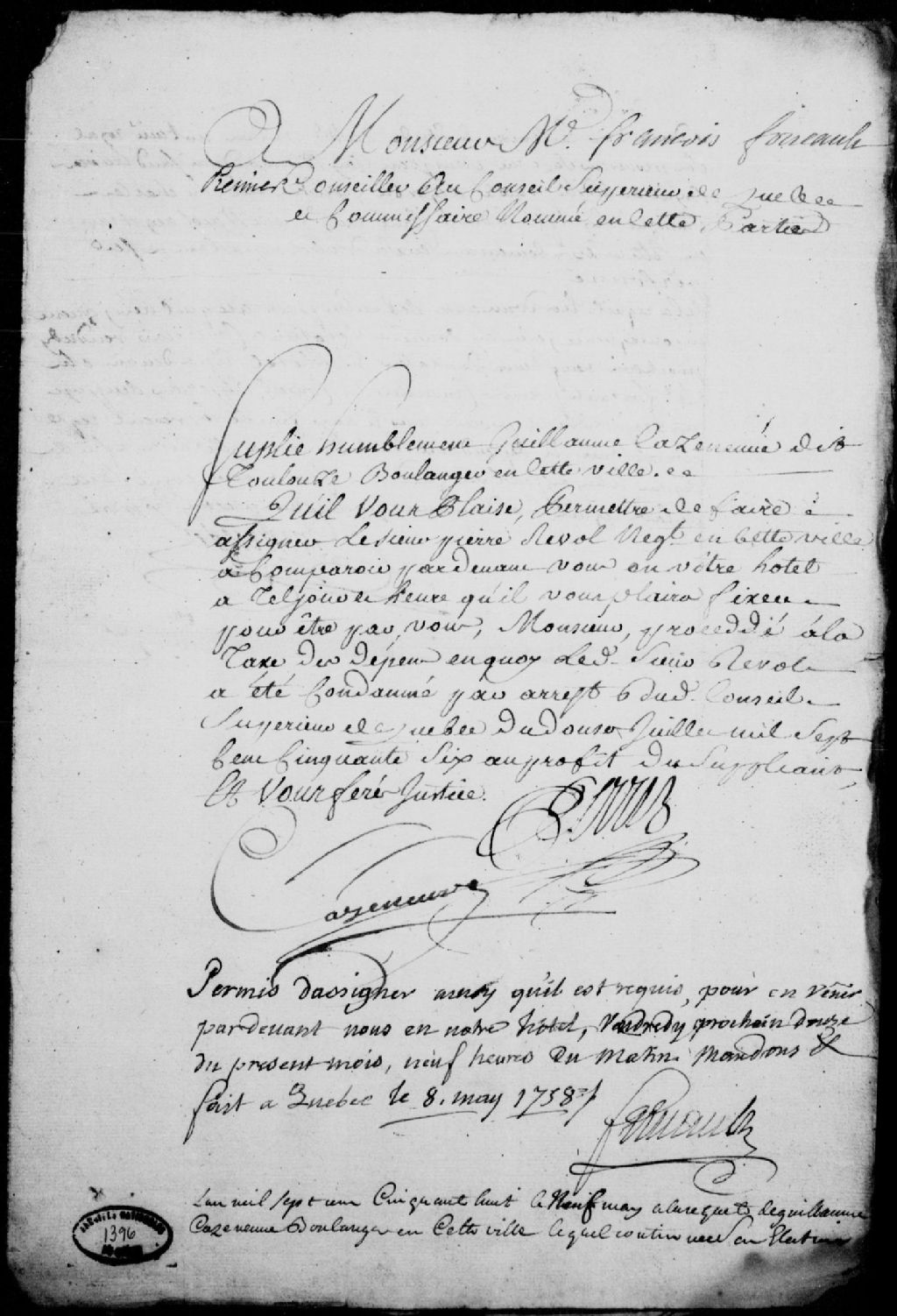 - Mémoire des dépens à payer par Pierre Revol, négociant de Québec, à la requête de Guillaume Cazeneuve dit Coulonge (Caseneuve, Casseneuve dit Coulonges), boulanger de Québec, à la suite de l'arrêt du Conseil supérieur de Québec du 12 juillet 1756