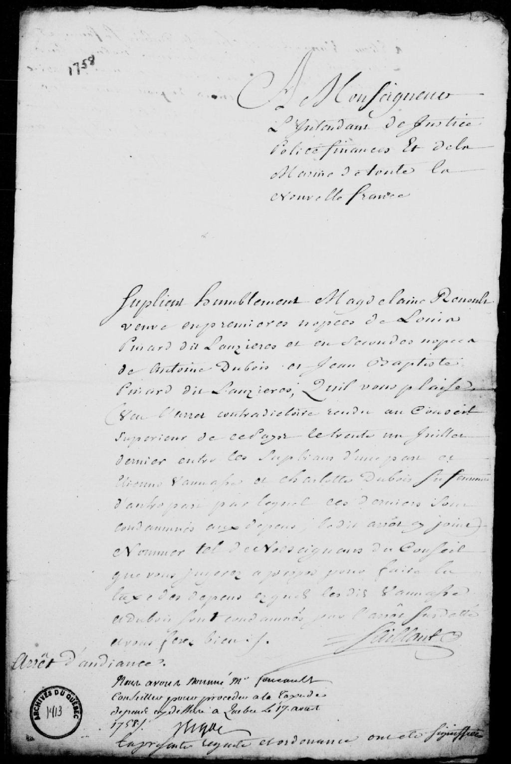 - Mémoire des dépens à payer par Étienne Vanasse, habitant de Saint-François, et Charlotte Dubois, sa femme, héritière de feu Antoine Dubois, à la requête de Madeleine Renaud, veuve en premières noces de Louis Pinard dit Lauzière (Lauzier) et en secondes d'Antoine Dubois, à la suite de l'arrêt du Conseil supérieur de Québec du 31 juillet 1758