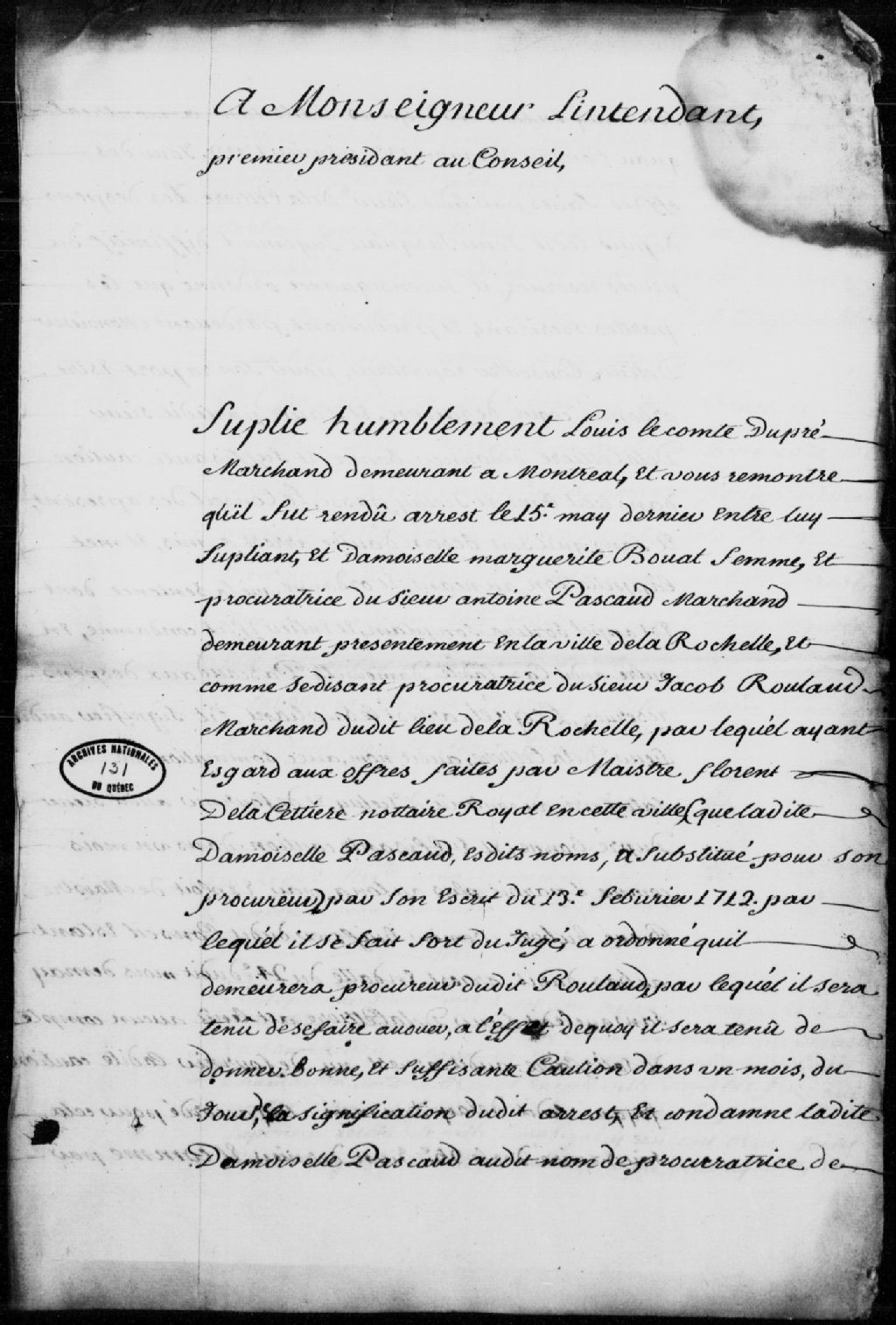 - Mémoire des dépens à payer par Marguerite Bouat, femme et procuratrice d'Antoine Pascaud (Pacaud), marchand de La Rochelle, à la requête de Louis Lecomte Dupré, marchand demeurant à Montréal, à la suite de l'arrêt du Conseil supérieur de Québec du 15 mai 1713