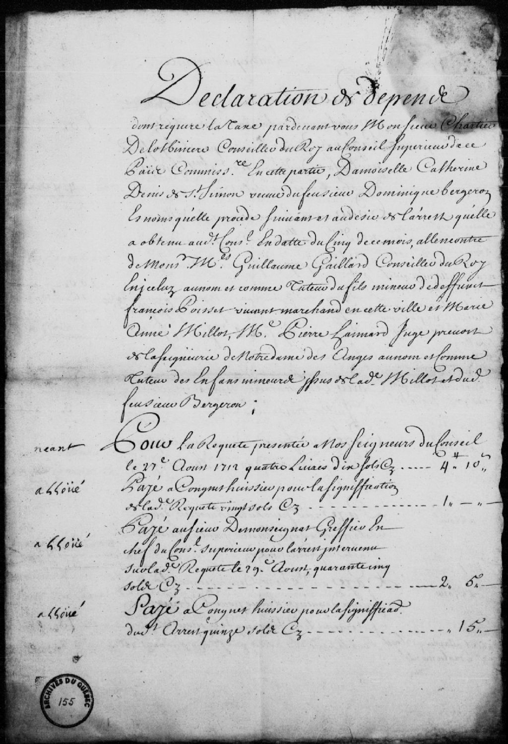 Mémoire des dépens à payer par les sieurs Guillaume Gaillard, conseiller, tuteur de François Poisset, mineur issu du mariage de feu François Poisset, de son vivant marchand à Québec, et de feue Marie-Anne Milot, et Pierre Haimard, juge prévôt de Notre-Dame-des-Anges, au nom et comme tuteur des enfants mineurs du feu Bergeron et de feue Marie-Anne Milot, sa première femme, à la requête de Louise-Catherine Denis de Saint-Simon, veuve de feu Dominique Bergeron, à la suite de deux arrêts du Conseil supérieur de Québec en date du 11 août 1712 et du 5 février 1714, 26 février 1714 - 16 mars 1714, Archives nationales à Québec, Fonds Conseil souverain, (03Q,TP1,S30,D53).