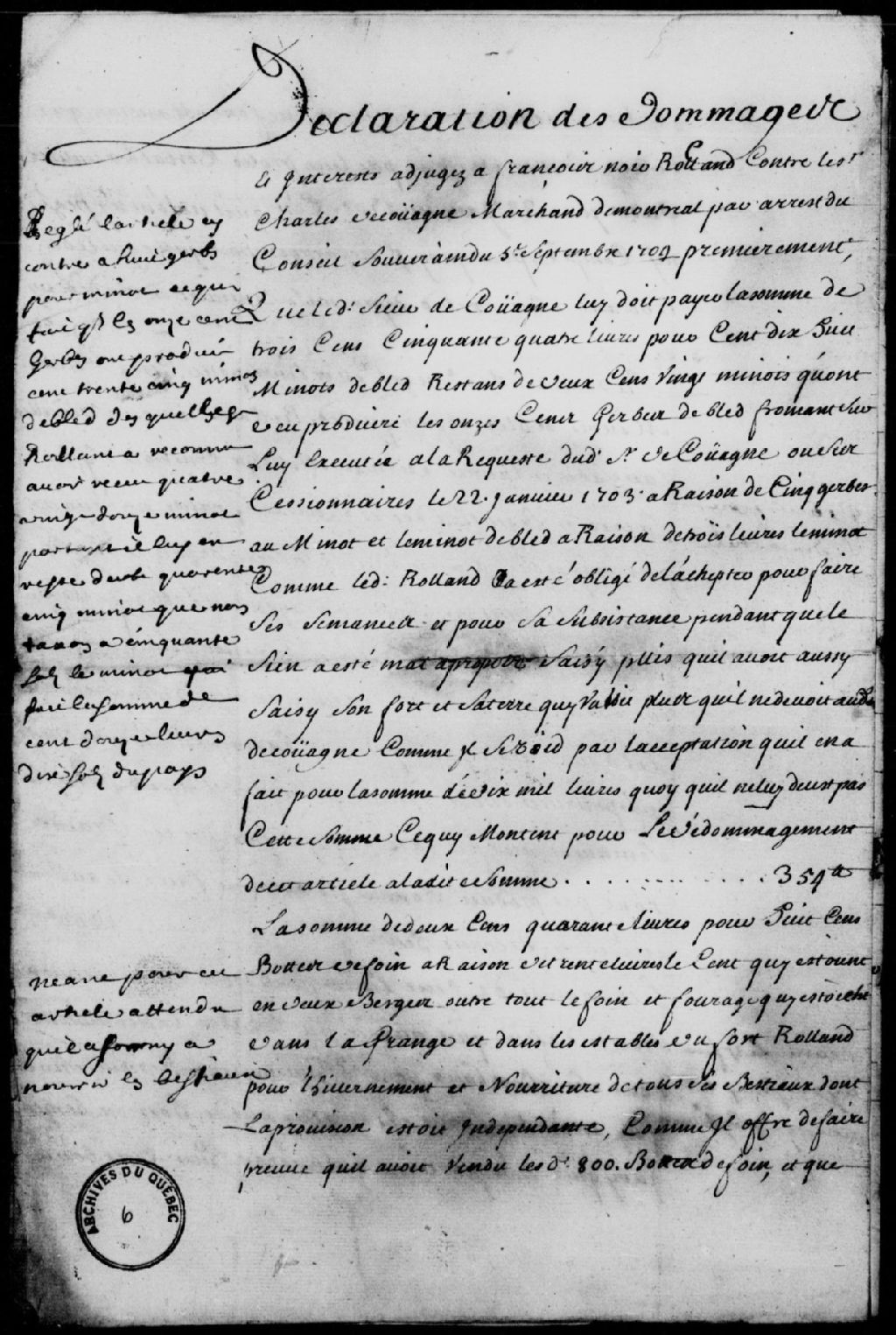 - Mémoire des dépens à payer par Charles de Couagne, marchand de Montréal, à François Noir Rolland (LeNoir), à la suite d'un arrêt du Conseil supérieur de Québec du 5 septembre 1704 pour des minots de blé
