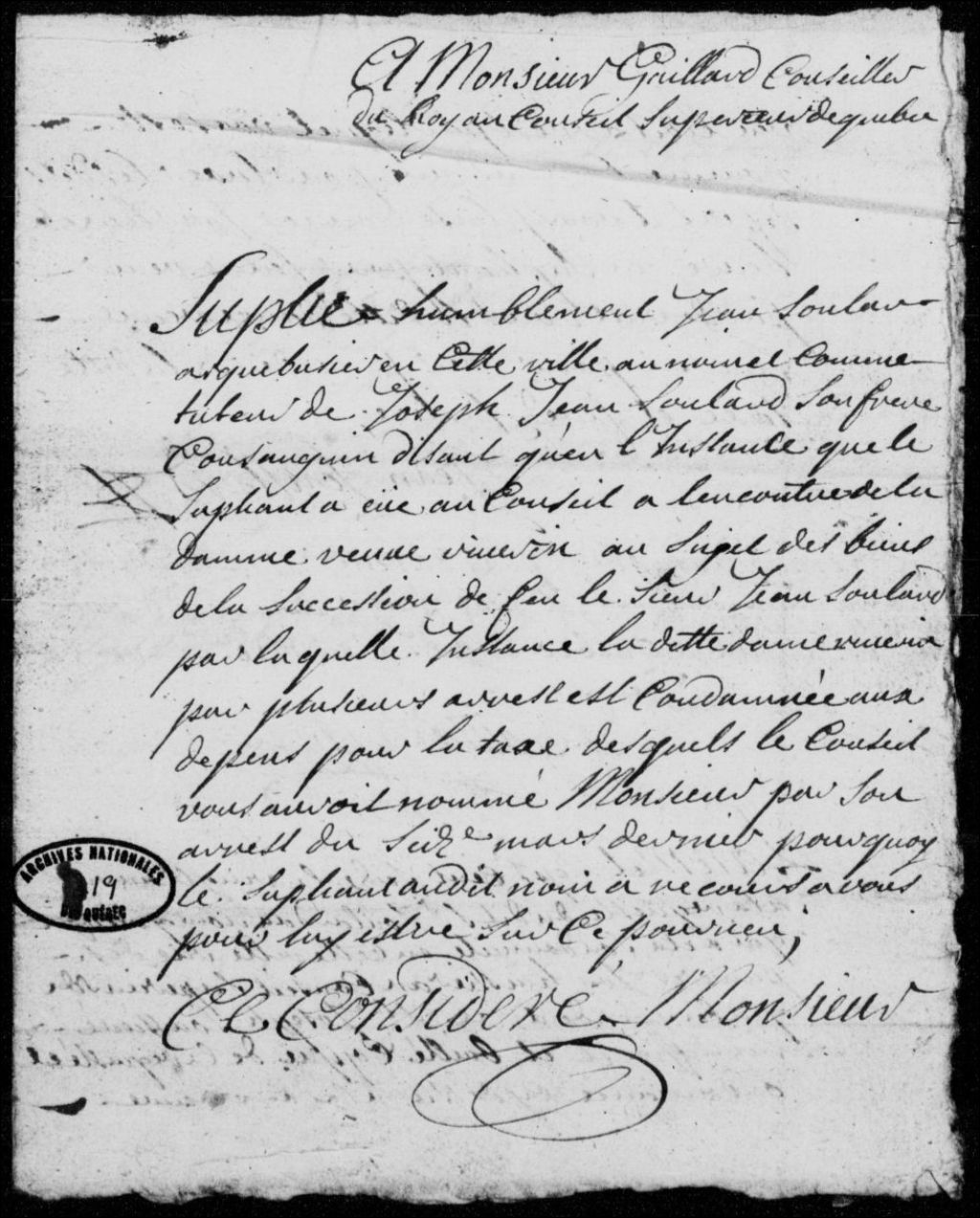 - Ce dossier comprend la requête, le mémoire des dépens, une signification, une assignation et un procès-verbal signé Gaillard et Rivet. Les pièces sont signées par Soulard, Gaillard, Dubreuil, Rivet et de Monseignat