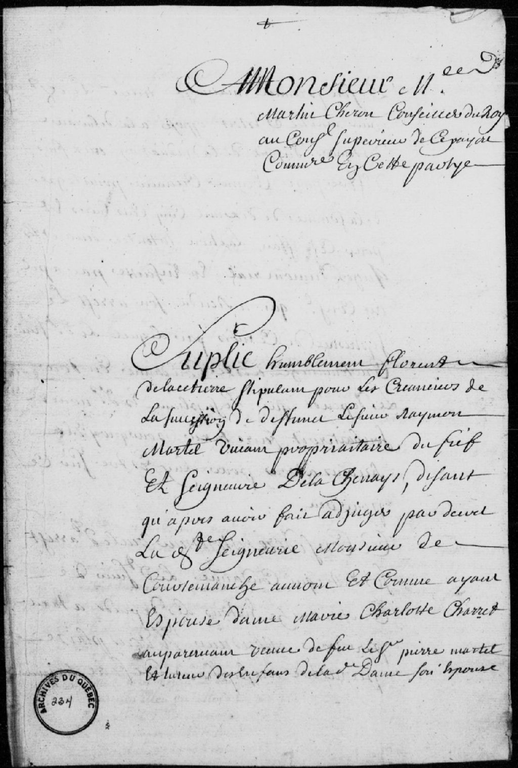 - Mémoire des dépens à payer par Augustin LeGardeur (Le Gardeur), sieur de Courtemanche, à la requête de Florent de la Cettière (LaCetière, La Cetière), pour les créanciers de la succession du défunt Raymond Martel, à la suite de l'arrêt du Conseil supérieur de Québec du 7 décembre 1716
