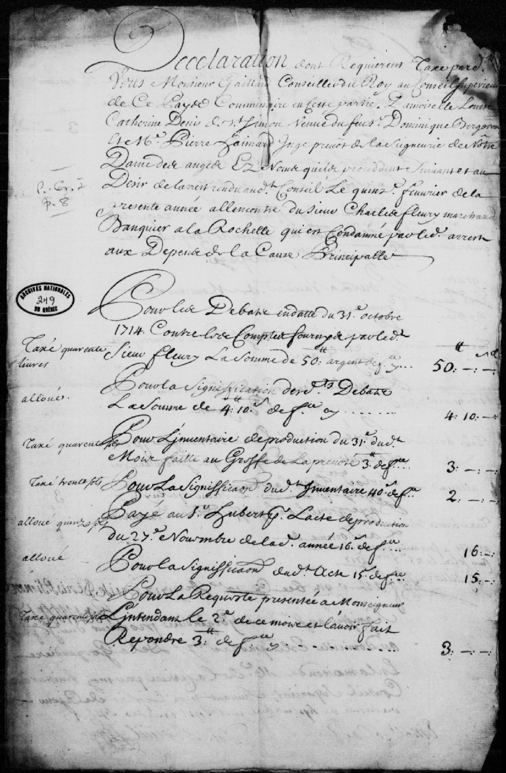 Mémoire des dépens à payer par Charles Fleury, marchand banquier de La Rochelle, à la requête de Théodore Denys (Denis), sieur de Vitré, faisant pour damoiselle Louise-Catherine Denys de Saint-Simon, veuve de Dominique Bergeron, marchand de Québec, et tutrice des enfants mineurs issus de leur mariage, et Pierre Haimard, juge prévôt de Notre-Dame-des-Anges, au nom et comme tuteur des enfants mineurs dudit feu Dominique Bergeron et de feue Marie-Anne Milot, sa première femme, à la suite de l'arrêt du Conseil supérieur de Québec du 15 février 1717