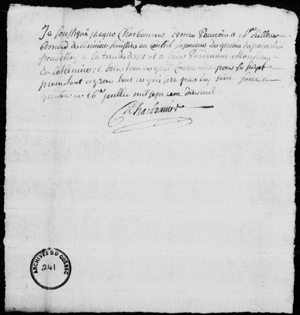 Mémoire des dépens à payer par François Demers dit Montfort, voyageur, à la requête de Jacques Charbonnier, marchand de Montréal, à la suite des arrêts du Conseil supérieur de Québec des 4 juillet 1718 et 11 juillet 1718, 16 juillet 1718 - 27 juillet 1718, Archives nationales à Québec, Fonds Conseil souverain, (03Q,TP1,S30,D83).
