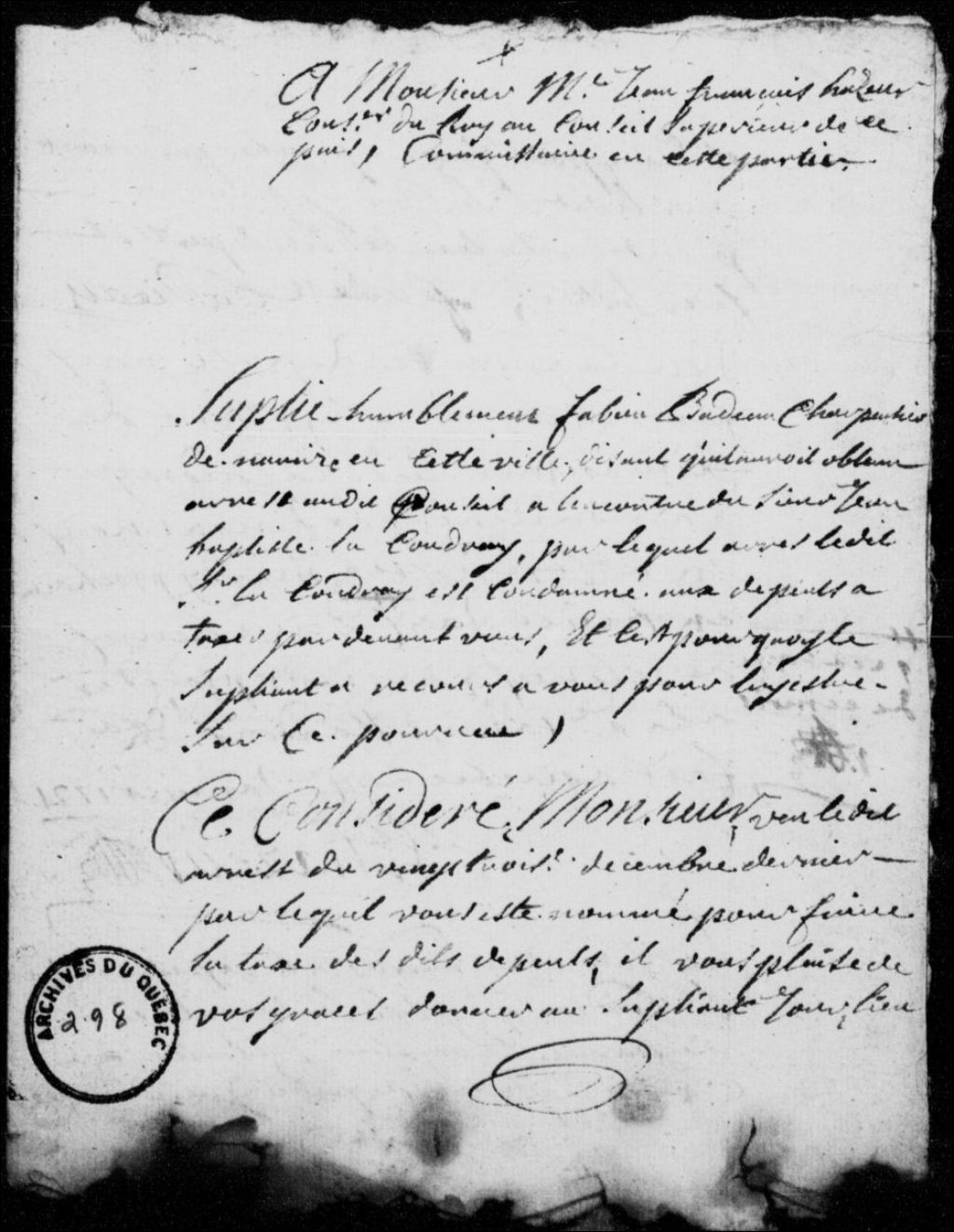 Mémoire des dépens à payer par Jean-Baptiste Lacoudraye (LaCoudraye, La Coudraye), marchand, à la requête de Fabien Badeau, charpentier de navire, à la suite de l'arrêt du Conseil supérieur de Québec du 23 décembre 1720, 4 janvier 1721 - 14 janvier 1721, Archives nationales à Québec, Fonds Conseil souverain, (03Q,TP1,S30,D93).