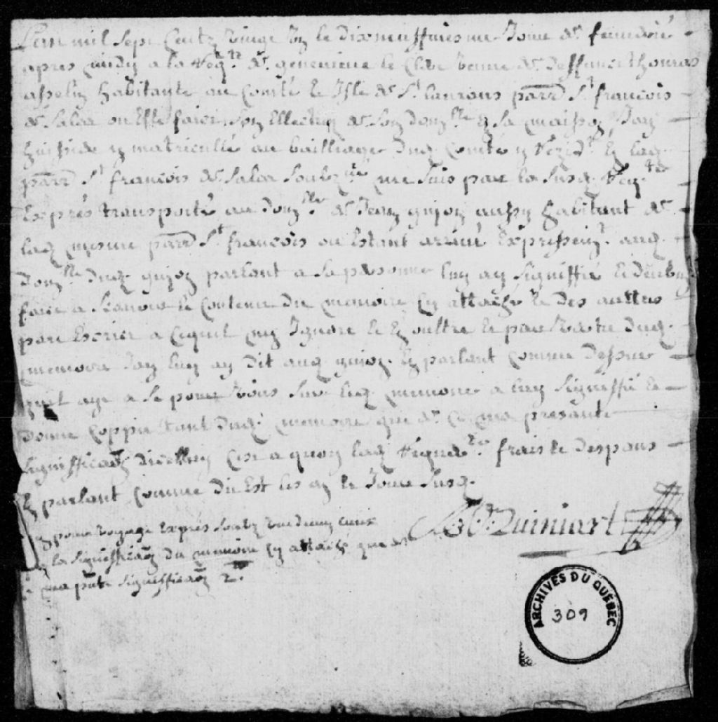 Mémoire des dépens à payer par Jean Guyon (Guion), habitant de l'île et comté de Saint-Laurent (île d'Orléans), à la requête de Geneviève Leclerc, veuve de Thomas Asselin, de son vivant habitant dudit lieu, à la suite de l'arrêt du Conseil supérieur de Québec du 18 novembre 1720, 17 juillet 1721 - 28 juillet 1721, Archives nationales à Québec, Fonds Conseil souverain, (03Q,TP1,S30,D97).