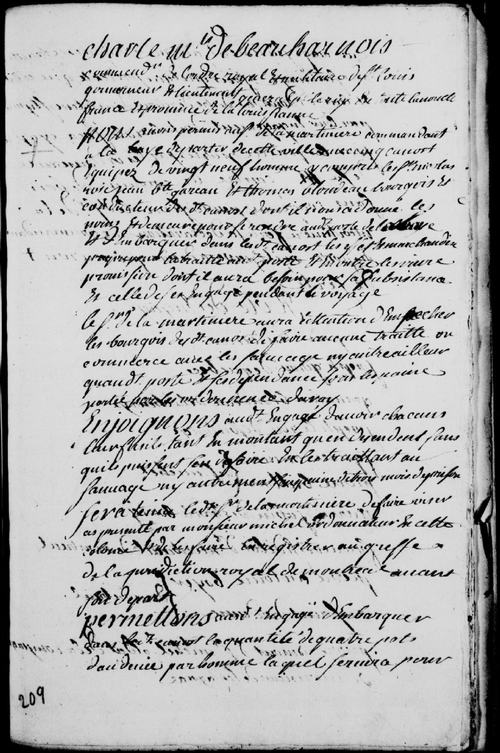 Congé de cinq canots par Charles de Boische, Marquis de Beauharnois, gouverneur de la Nouvelle-France, au sieur de la Martinière (LaMartinière), commandant à la Baye (Baie), lesquels canots devant partir de Montréal pour se rendre au poste de la Baye (Baie) et devant contenir à leur bord vingt-neuf hommes en tout, à savoir Nicolas Rose, Jean-Baptiste Gareau et Thomas Blondeau, bourgeois et conducteurs desdits canots, Joseph Girou (Giroux), de Québec, Germain Blondeau, de Lachenaie, Joseph Lerou (Leroux), de Soulanges, Ignace Crevier et Pierre Brillon (Brion), de Saint-Michel, Pierre Jobin, de Charlesbourg, François Sedilot dit Montreuil (Sédillot), de Montréal, Pierre-Antoine Boyer et Toussaint Dardenne, de Montréal, Pierre Dumont dit Saint-Michel, soldat de la compagnie du sieur de Lentagnac (Lantagnac), Joseph Vaudry et Louis Archambeault (Archambault), de la Pointe-aux-Trembles de Montréal, Augustin Foucher dit Châteauvert (Faucher), de Neuville, François-de-Sales Foucher dit Châteauvert (Faucher), de Québec, Joseph Fafart (Fafard), de l'île Saint-Ignace, Nicolas Brousseau, de L'Assomption, François Lécuyer, de la Montagne, Jean-Baptiste Auger, de la rivière du Loup, Michel Barbarie dit Grandmaison (Barbary), Jean-Baptiste Gautier dit Saguingora (Gauthier dit Saguingoira), François-Marie Cardinal, Pierre Brunet dit Létang, André Presseau et Antoine Pilon, tous de la Pointe-Claire, et Jacques Meilleur et Antoine Quenneville, du Sault-au-Récollet