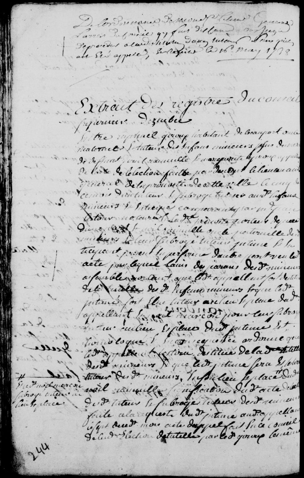 Arrêt du Conseil supérieur de Québec mettant à néant un appel de l'acte d'élection d'un tuteur et d'un subrogé tuteur aux mineurs dans la cause entre Raphaël Giroux, habitant de Beauport, oncle maternel et tuteur des enfants mineurs de feu Paul Rainville et Marguerite Giroux, contre Noël Rainville, oncle paternel desdits mineurs et leur subrogé tuteur, ledit Conseil déclarant toute la procédure nulle et faisant droit sur le réquisitoire du procureur général du Roi et faisant défense au lieutenant général de la Prévôté de Québec et à tous les autres juges de procéder à l'avenir à aucune destitution de tuteur sans au préalable que lesdits tuteurs n'aient été appelés ou entendus, 17 mars 1738, Archives nationales à Québec, Fonds Conseil souverain, (03Q,TP1,S35,D9,P126).