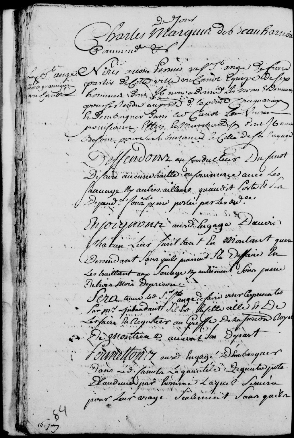 Congé d'un canot par Charles de Boische, Marquis de Beauharnois, gouverneur de la Nouvelle-France, au sieur Saint-Ange, lequel canot devant partir de Montréal pour se rendre au poste de la pointe Chagouamigon (Chaquamigon) et devant contenir à son bord six hommes