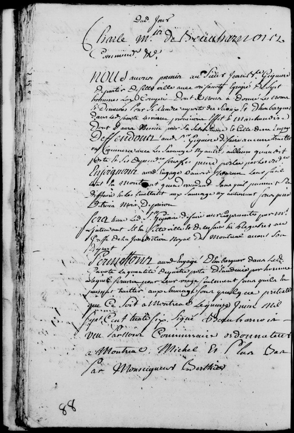 Congé d'un canot par Charles de Boische, Marquis de Beauharnois, gouverneur de la Nouvelle-France, au sieur Jean-Baptiste Giguiere (Giguère), lequel canot devant partir de Montréal pour se rendre au poste des Sioux et devant contenir à son bord sept hommes, ledit Giguiere compris