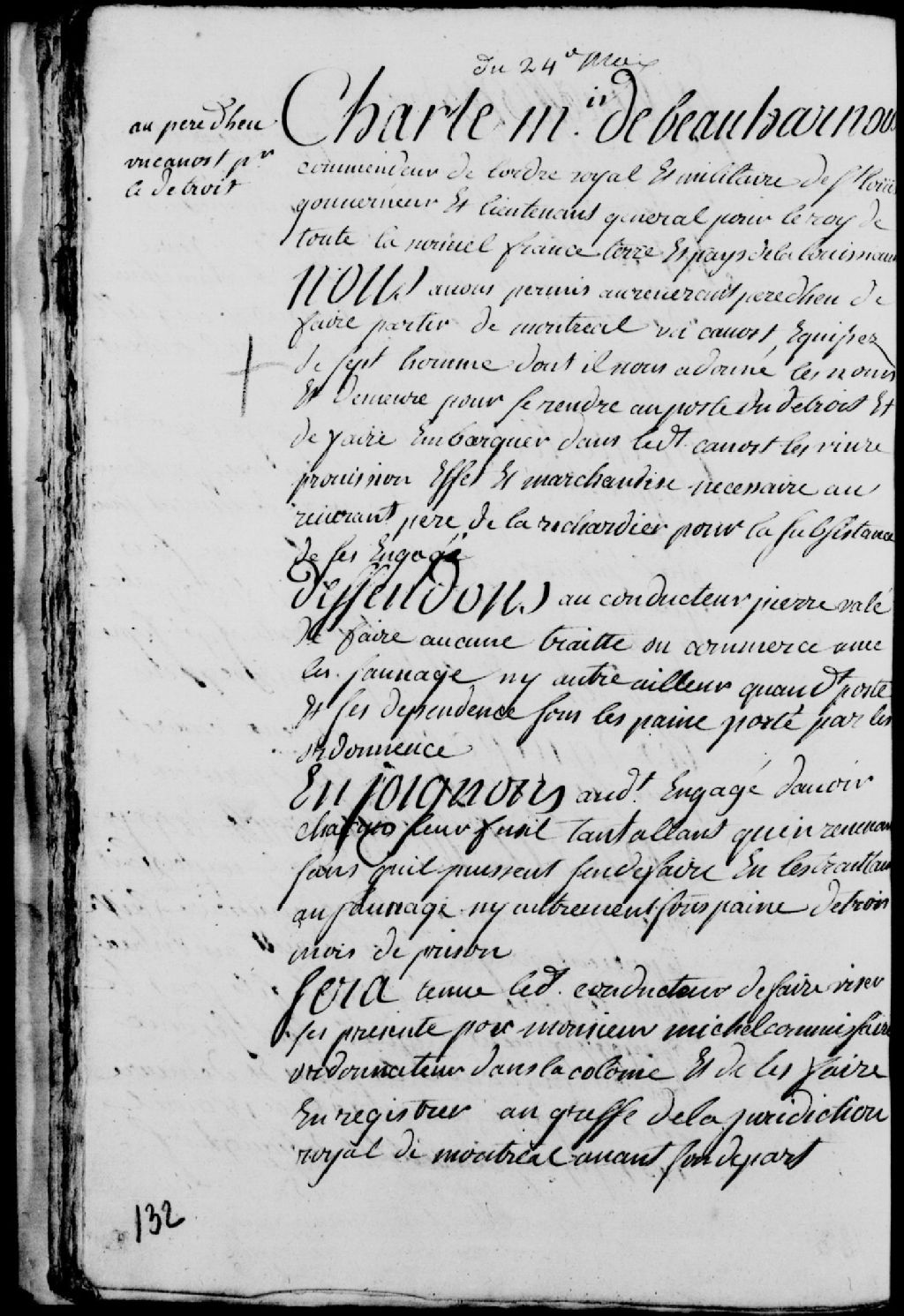 Congé d'un canot par Charles de Boische, Marquis de Beauharnois, gouverneur de la Nouvelle-France, au Révérend Père Dheu (d'Heu), lequel canot devant partir de Montréal pour se rendre au poste du détroit (Détroit) et devant contenir à son bord sept hommes, dont le Révérend Père de la Richerdière (LaRicherdière, LaRichardière) avec Pierre Valé (Vallée) comme conducteur, lequel congé étant accompagné d'une permission faite audit Vallée d'apporter deux barils d'eau-de-vie de plus