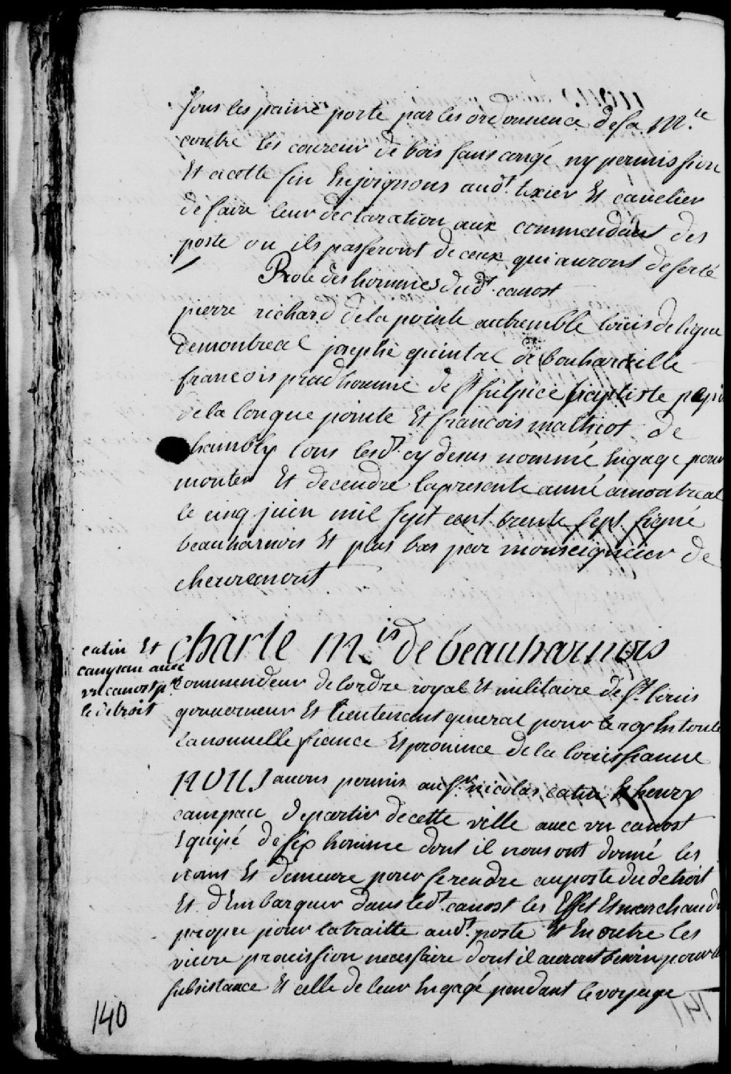 Congé d'un canot par Charles de Boische, Marquis de Beauharnois, gouverneur de la Nouvelle-France, aux sieurs Nicolas Catin et Henri Campau (Campeau), lequel canot devant partir de Montréal pour se rendre au poste du détroit (Détroit) en passant par le nord du lac Ontario et devant contenir à son bord six hommes, à savoir Laurent Dagenes (Dagenais), de Saint-Michel, François Robert, de la Prairie-de-la-Madeleine, Baptiste la Rivière (LaRivière), de Saint-Ours, Jacques Labonté, de Boucherville, François Benois (Benoît), de Saint-Ours, et Charles Pilet, de Boucherville, 6 juin 1737, Archives nationales à Québec, Fonds Conseil souverain, (03Q,TP1,S35,D9,P78).