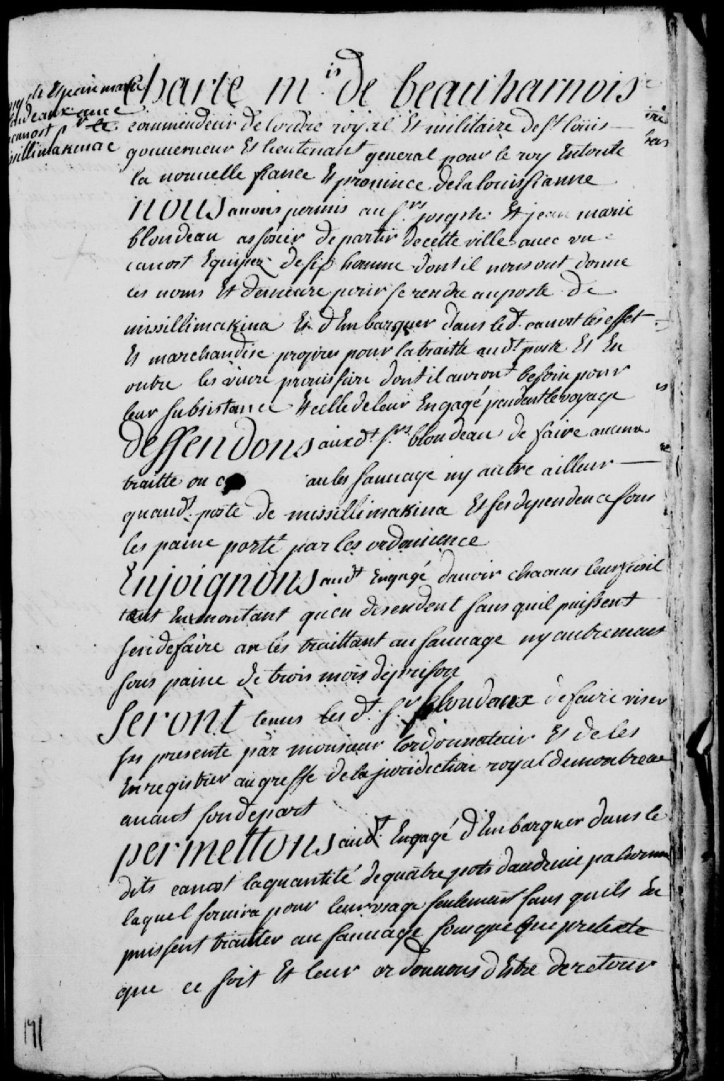 Congé d'un canot par Charles de Boische, Marquis de Beauharnois, gouverneur de la Nouvelle-France, aux sieurs Joseph Blondeau et Jean-Marie Blondeau, associés, lequel canot devant partir de Montréal pour se rendre au poste de Michilimakinac et devant contenir à son bord six hommes, à savoir Pierre Sekayanis (Skianis, Scaianis) et Joseph Traversy, de Lachine, Jacques Bissonet (Bissonnet), de Lachine, Jean Catis (Caty), de la Pointe-aux-Trembles, et Jacques Parisien et Louis Parisien, du lac des Deux-Montagnes