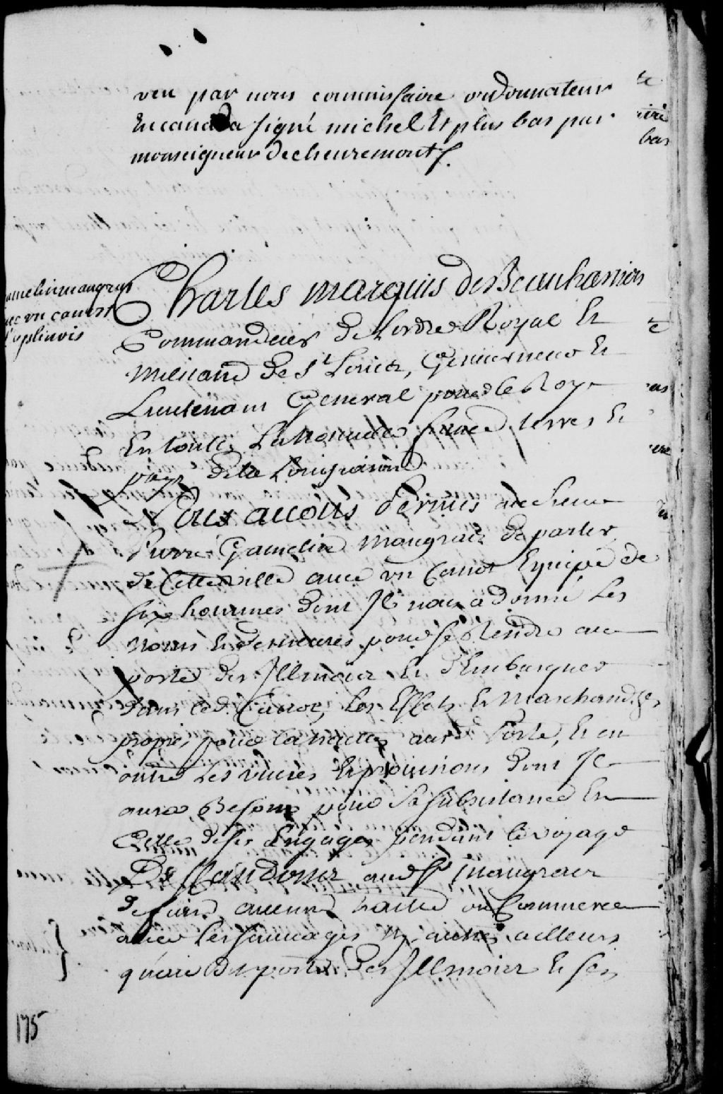 Congé d'un canot par Charles de Boische, Marquis de Beauharnois, gouverneur de la Nouvelle-France, au sieur Pierre Gamelin Maugras, lequel canot devant partir de Montréal pour se rendre au poste des Illinois et devant contenir à son bord six hommes, à savoir Charles Reaume (Rhéaume), de l'île Perrot, Pierre Lavallé (Lavallée), du chenail du Moine, Baptiste Ladouceur, Paul Ladouceur et Michel Ladouceur, frères, du bout de l'île d'en haut, et Joseph Dau (Daoust), du bout de l'île d'en haut