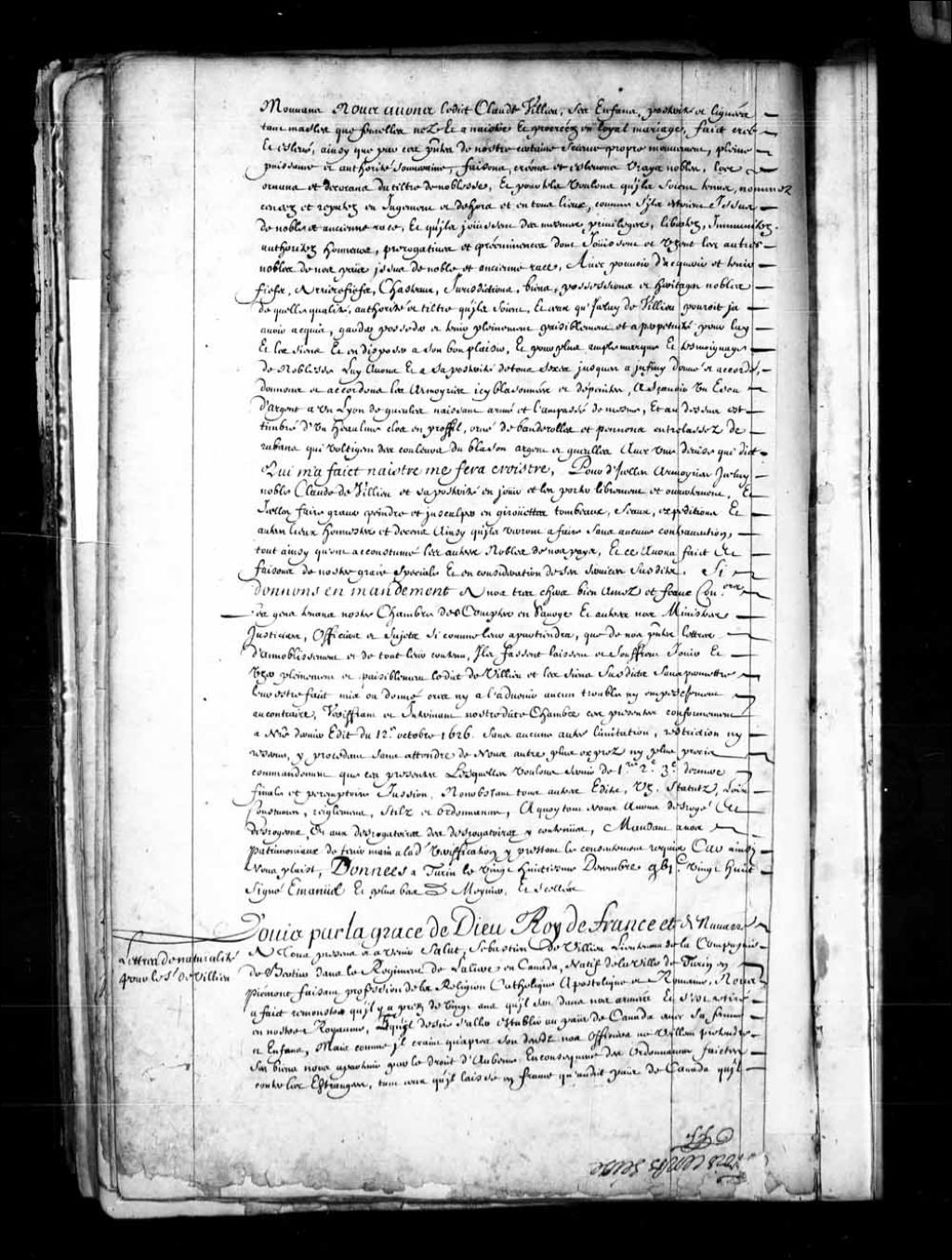 Lettres de naturalité pour Sébastien de Villieu, lieutenant de la compagnie de Berthier, dans le régiment de Salières en Canada, natif de la ville de Turin en Piémont, faisant profession de la religion catholique, apostolique et romaine, 1er juin 1668 - 30 juin 1668, Archives nationales à Québec, Fonds Conseil souverain, (03Q,TP1,S36,P122).
