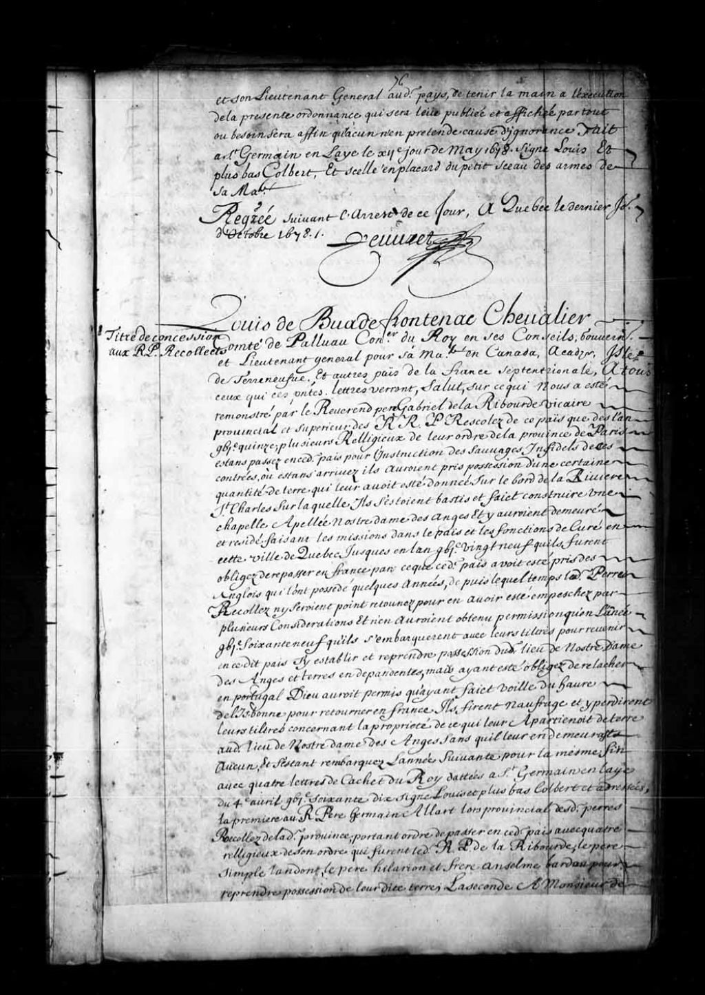 Concession par Louis de Buade, Comte de Frontenac, gouverneur et lieutenant général en la Nouvelle-France, aux Révérends Pères Récollets de 106 arpents de terre sur dix de front sur la rivière Saint-Charles à Québec, en droit de fief et de seigneurie, 29 mai 1673, Archives nationales à Québec, Fonds Conseil souverain, (03Q,TP1,S36,P149).