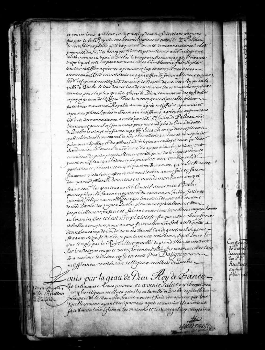 Lettres d'amortissement du Roi pour les 106 arpents de terre sur dix de front concédés aux Révérends Pères Récollets le 29 mai 1673 par Louis de Buade, Comte de Frontenac, gouverneur de la Nouvelle-France
