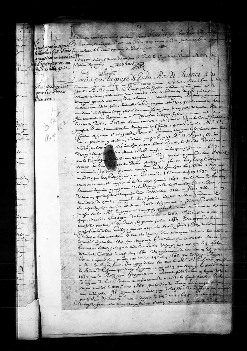 Lettres d'amortissement par le Roi en faveur des Révérends Pères Récollets, établis à Québec, des 106 arpents de terre où s'élèvent leurs bâtiments, 12 mai 1678, Archives nationales à Québec, Fonds Conseil souverain, (03Q,TP1,S36,P158).