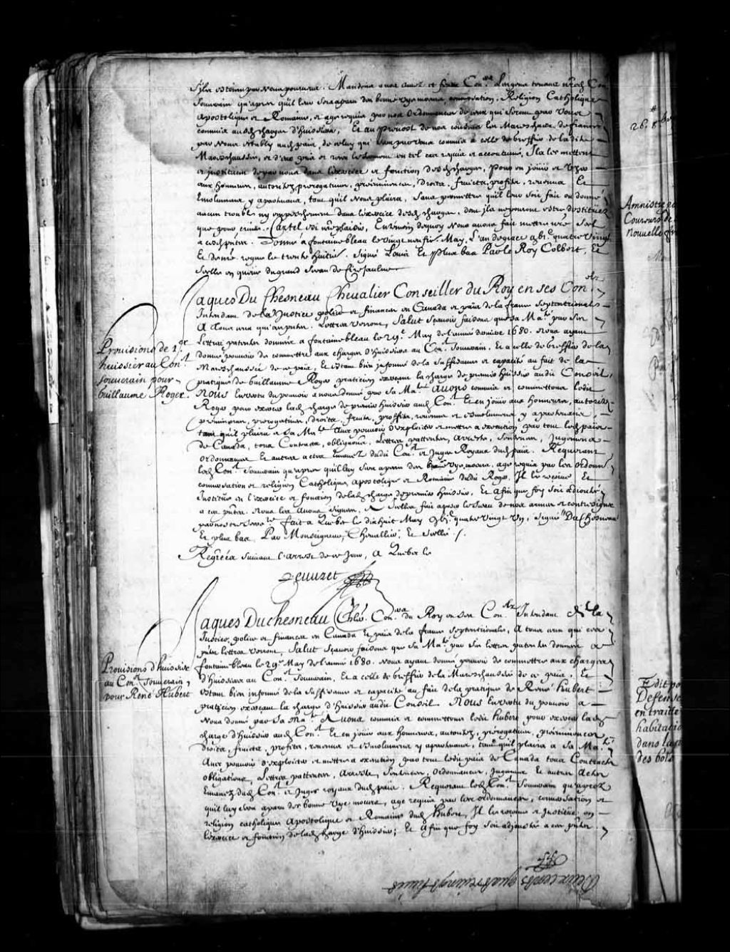 Commission de premier huissier au Conseil souverain de la Nouvelle-France par Jacques Duchesneau, intendant de la Nouvelle-France, à Guillaume Roger, praticien