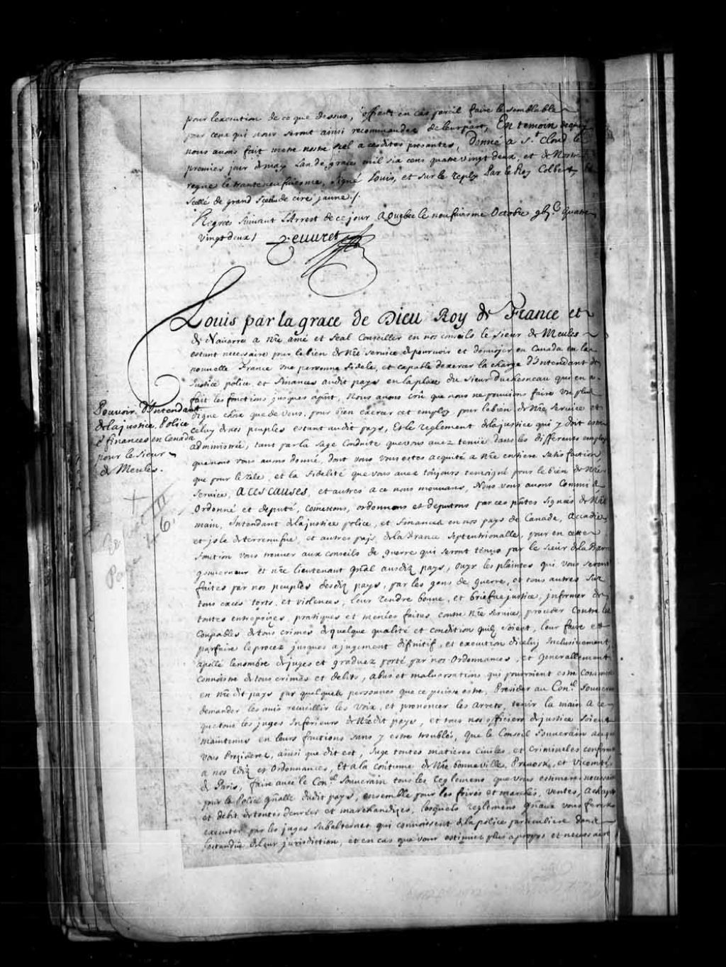 Provisions de gouverneur et lieutenant général en Canada, île de Terre-Neuve et autres pays de la France septentrionale pour le sieur Joseph-Antoine Lefebvre de La Barre, en remplacement du sieur Louis de Buade, Comte de Frontenac, rappelé en France