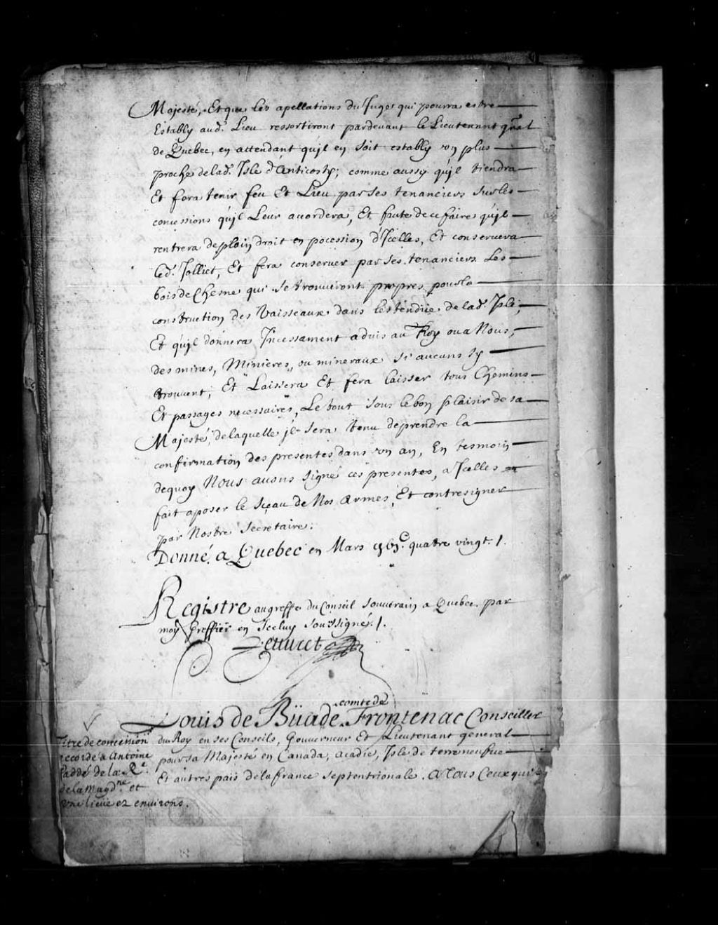 Concession par Louis de Buade, Comte de Frontenac, gouverneur de la Nouvelle-France, à Antoine Cadé (Caddé), demeurant à Québec, d'une lieue de terre par deux lieues de profondeur, à la rivière de la Madeleine, le long du fleuve Saint-Laurent
