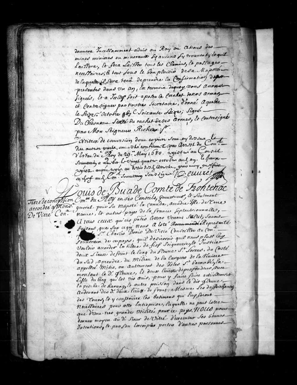 Concession par Louis de Buade, Comte de Frontenac, gouverneur de la Nouvelle-France, à Charles Denis de Vitré, conseiller au Conseil souverain de ce pays, de deux lieues de front le long du fleuve Saint-Laurent, en montant ledit fleuve, et deux lieues de profondeur, laquelle concession comprenant en outre l'île du Bic qui est vis-à-vis, avec le droit de chasse, même celui de traite avec les Sauvages (Amérindiens), à titre de fief, seigneurie et justice