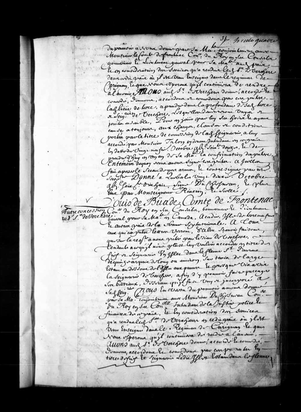 Concession par Louis de Buade, Comte de Frontenac, gouverneur de la Nouvelle-France, au sieur de Verchères d'îles dans le fleuve Saint-Laurent à proximité de la seigneurie de Verchères