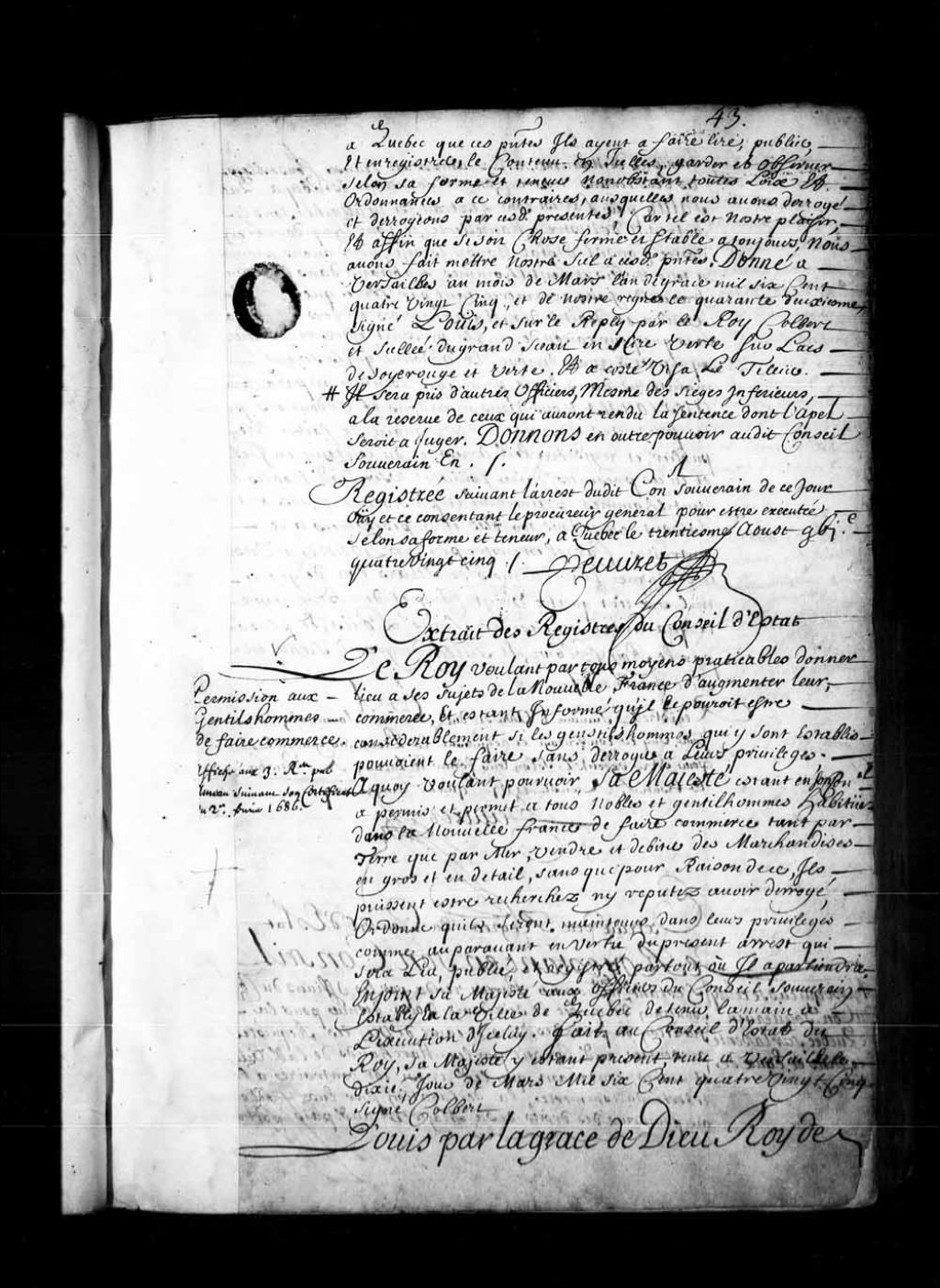 Ordre du Roi au Conseil souverain de la Nouvelle-France de faire lire, publier et registrer l'arrêt de Son Conseil d'État du 10 mars 1685 permettant aux gentilshommes de faire commerce