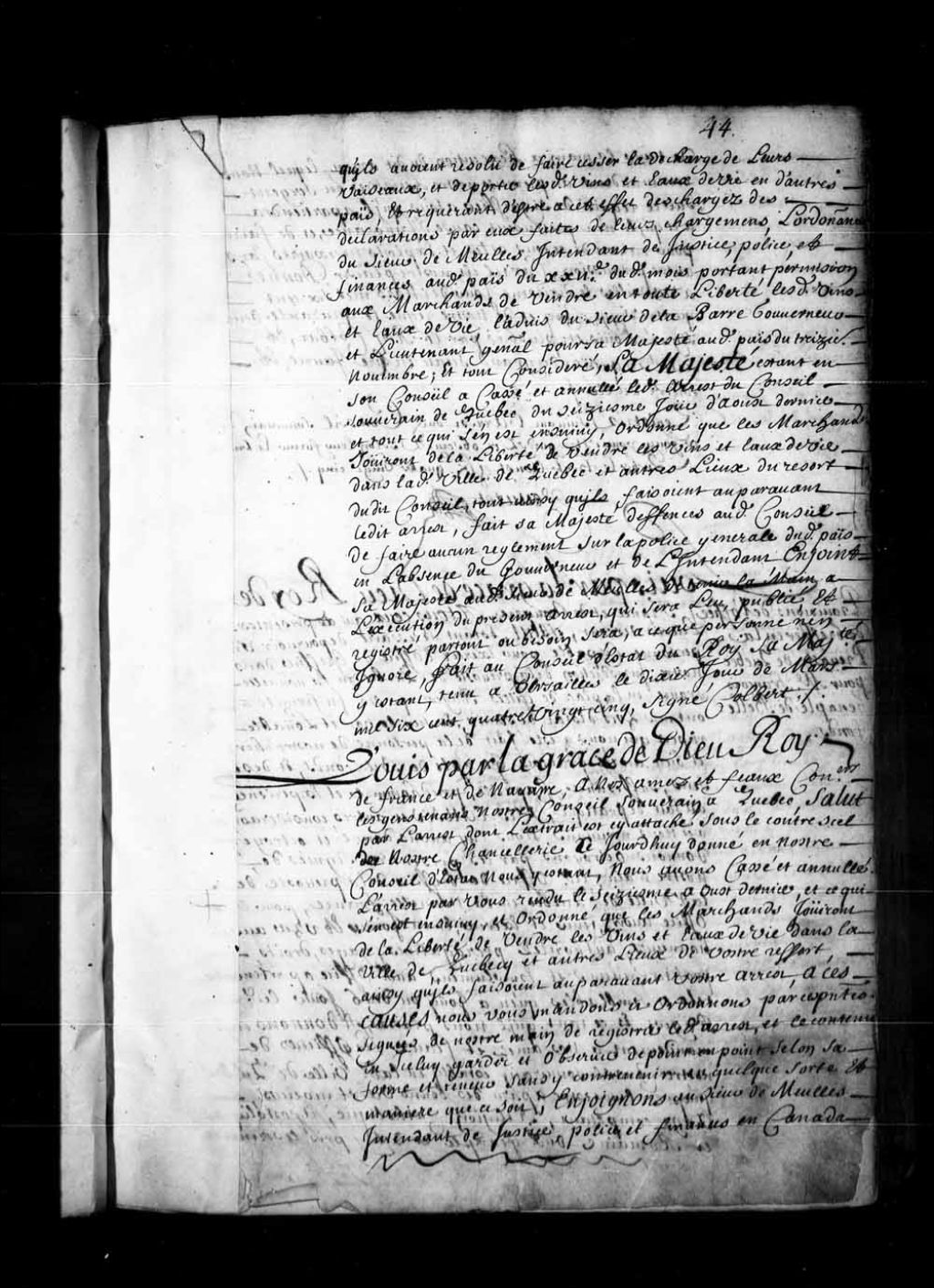 Brevet de confirmation par le Roi de l'arrêt de Son Conseil d'État cassant l'arrêt du Conseil souverain de la Nouvelle-France du 16 août 1684 pour la fixation du prix des vins et eaux-de-vie (alcools), 10 mars 1685, Archives nationales à Québec, Fonds Conseil souverain, (03Q,TP1,S36,P243).