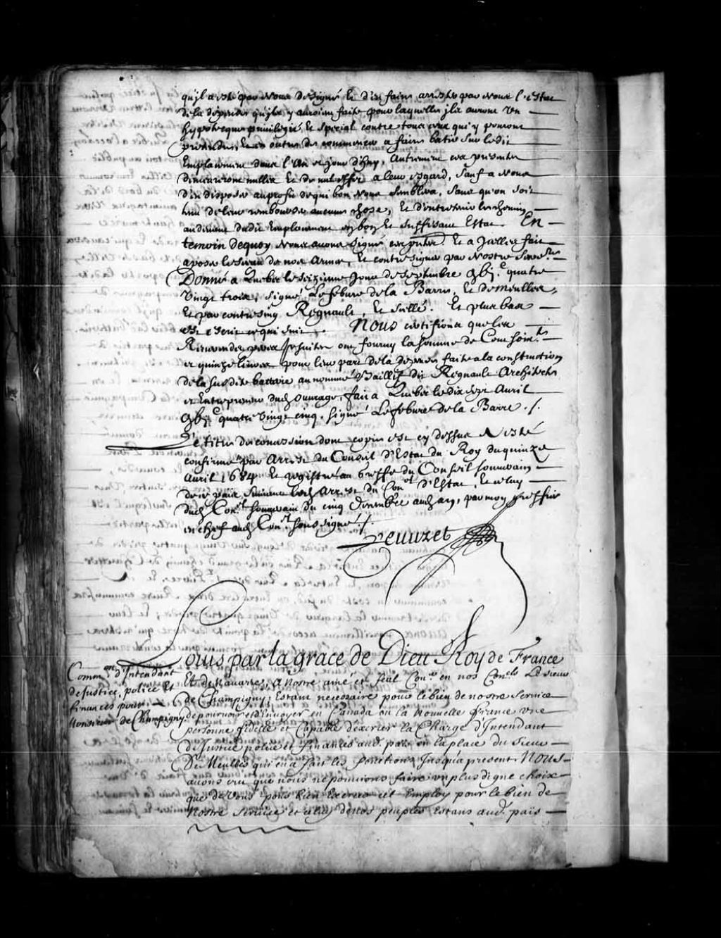 Lettres de provisions du Roi au sieur Jean Bochart de Champigny pour exercer la charge d'intendant de justice, police et finances en Canada, à la place du sieur Jacques de Meulles, 24 avril 1686, Archives nationales à Québec, Fonds Conseil souverain, (03Q,TP1,S36,P253).