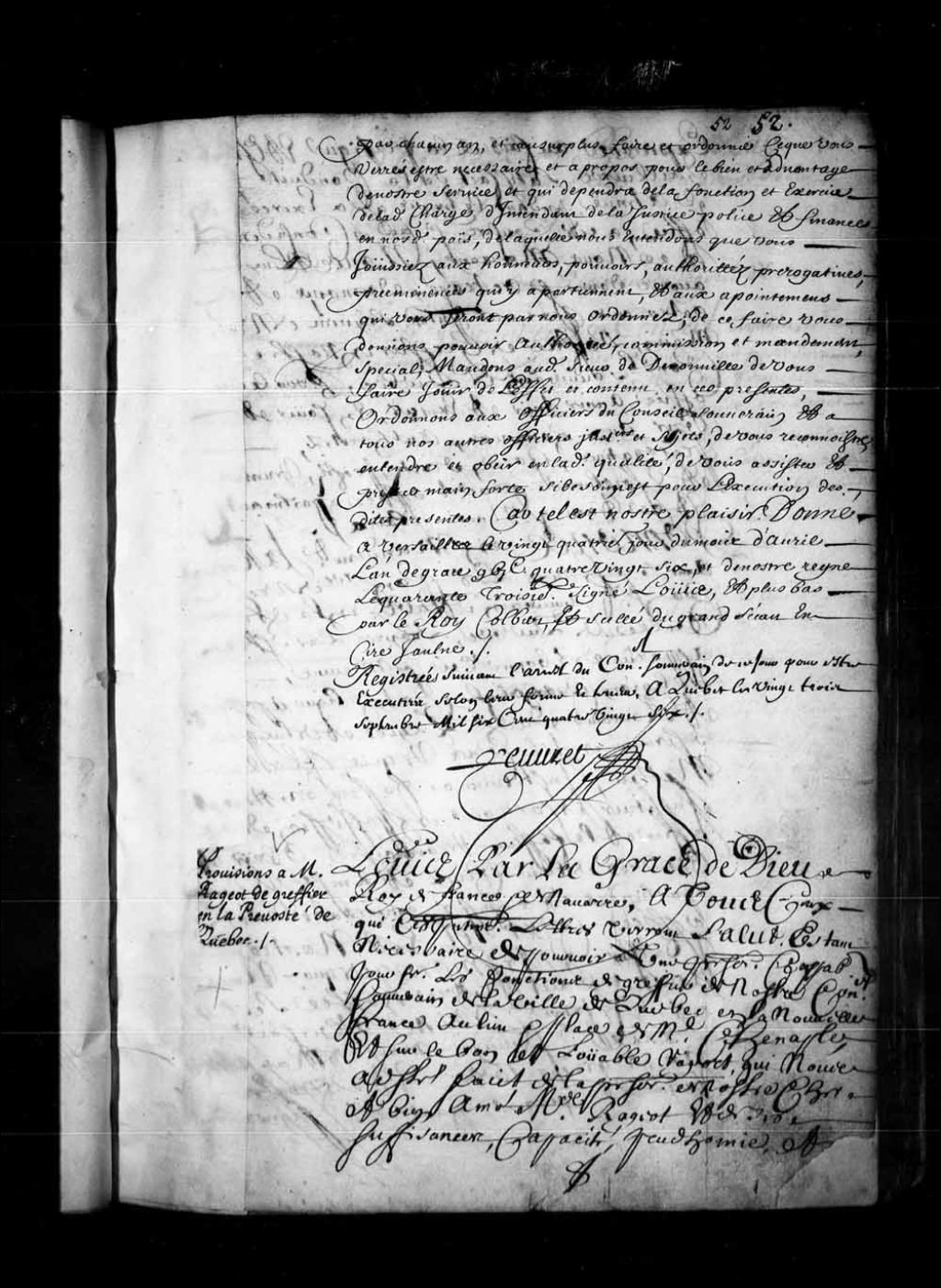 Lettres de provisions du Roi à maître Rageot des fonctions de greffier du Conseil souverain de la Nouvelle-France à la place de maître Genaple, 24 mai 1686, Archives nationales à Québec, Fonds Conseil souverain, (03Q,TP1,S36,P254).
