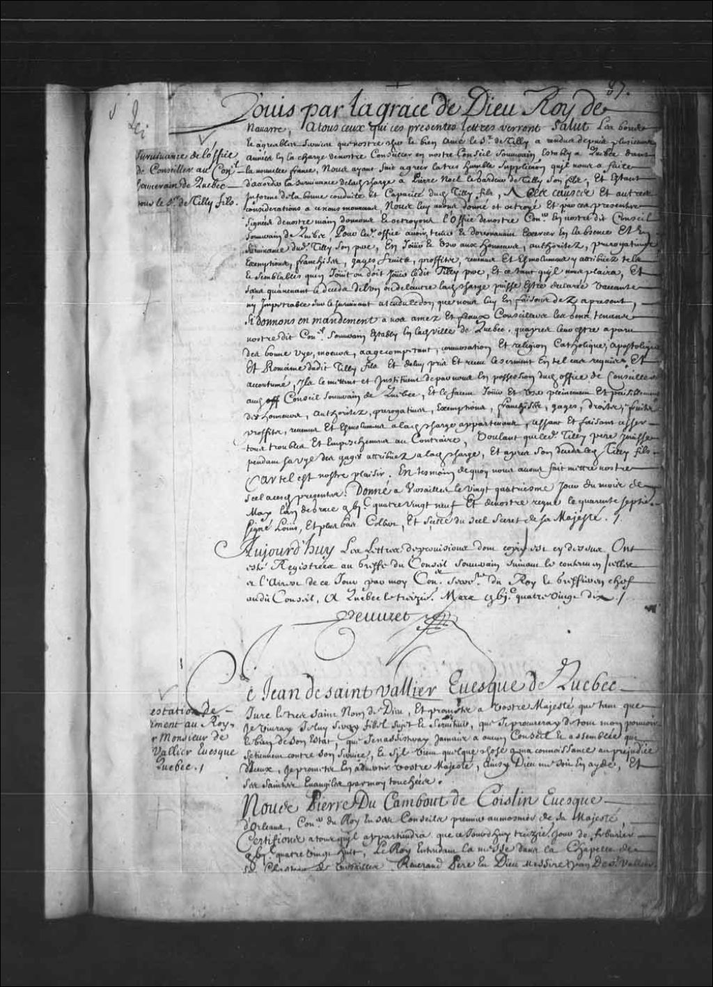 Lettres de survivance par le Roi de l'office de conseiller au Conseil souverain de la Nouvelle-France pour Pierre-Noël Legardeur de Tilly (Le Gardeur)