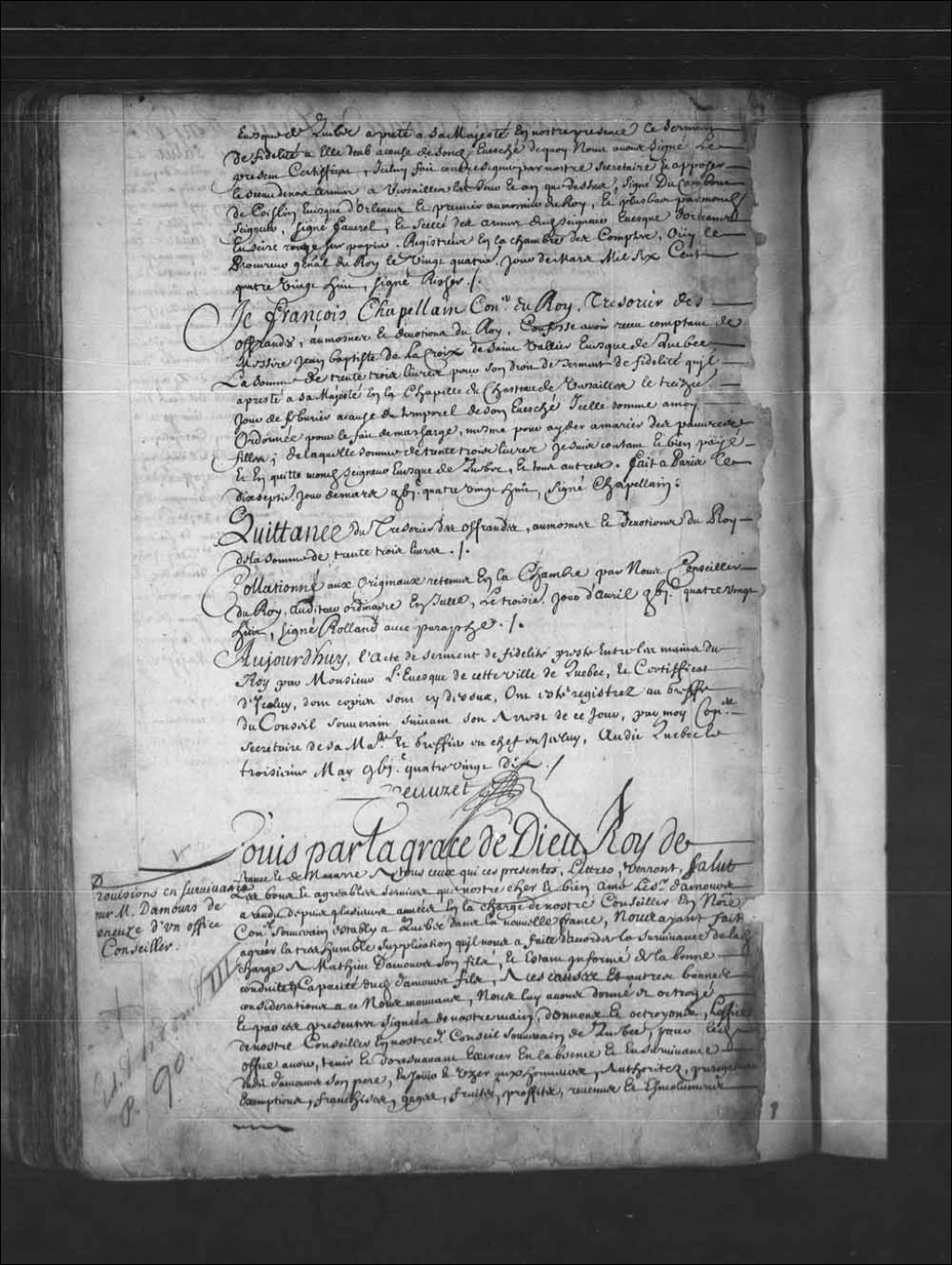 Lettres de survivance par le Roi de l'office de conseiller au Conseil souverain de la Nouvelle-France pour Mathieu Damours de Freneuse, 24 mai 1689, Archives nationales à Québec, Fonds Conseil souverain, (03Q,TP1,S36,P300).