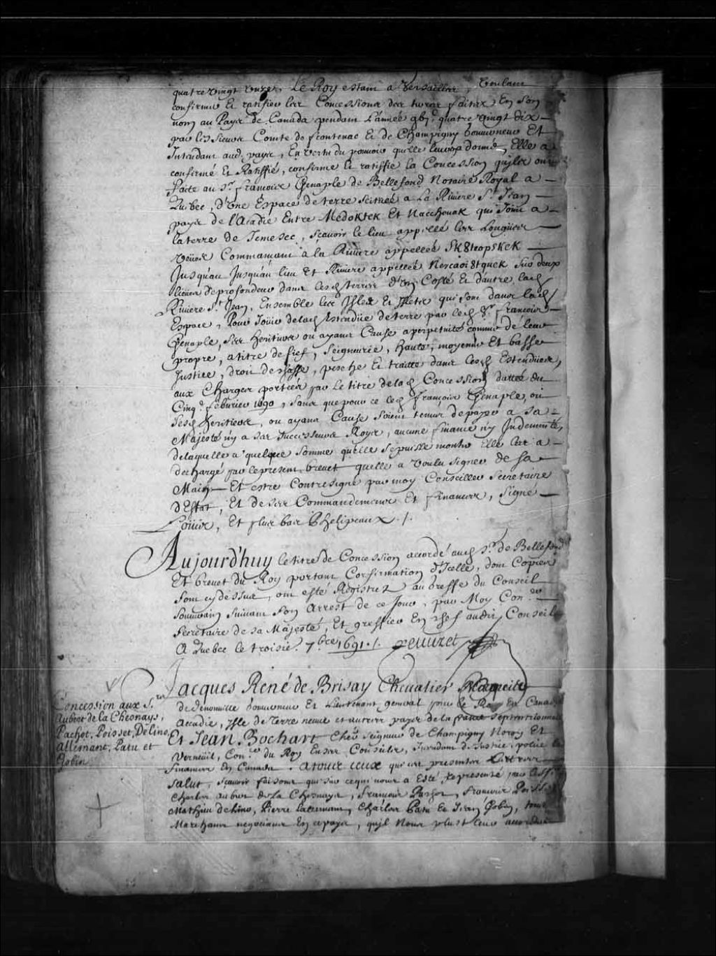 Acte de concession par Jacques-René de Brisay, Marquis de Denonville, et Jean Bochart Champigny, gouverneur et intendant de la Nouvelle-France, aux sieurs Charles Aubert de la Chenaye (La Chesnaye, LaChesnaye, Lachenaie), François Pachot, François Poisset, Mathieu de Lino (DeLino), Pierre Lallement (Lallemand, Allemand), Charles Pattu (Patu) et Jean Gobin, tous marchands négociants en ce pays, de la permission de faire la pêche de molües (morues), baleines, loups-marins (phoques), marsouins et autres dans le golfe et fleuve Saint-Laurent entre le bas des Blancs-Sablons (dans la terre du Nord) situé en latitude par 51 degrés jusqu'au lieu concédé aux sieurs Riverin et compagnie au 52e degré sur ledit golfe Saint-Laurent dans l'île de Terre-Neuve jusqu'à la concession desdits sieurs Riverin et compagnie dans ladite île, pour en jouir par eux à toujours par portions égales de trois lieues de front sur trois lieues de profondeur dans la terre du Nord, et pareille quantité de terre dans l'île de Terre-Neuve