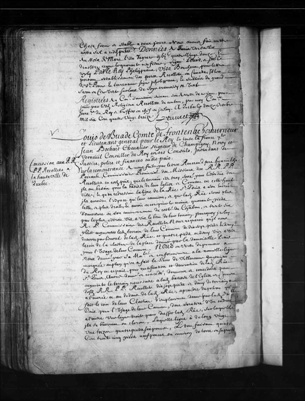 Acte de concession par Louis de Buade, Comte de Frontenac, et Jean Bochart Champigny, gouverneur et intendant de la Nouvelle-France, aux Révérends Pères Récollets d'un terrain de dix-sept pieds et demi sis en la Haute-Ville de Québec, à l'entrée de la rue Saint-Louis, afin d'y édifier leur église et leur couvent, 12 novembre 1692, Archives nationales à Québec, Fonds Conseil souverain, (03Q,TP1,S36,P335).