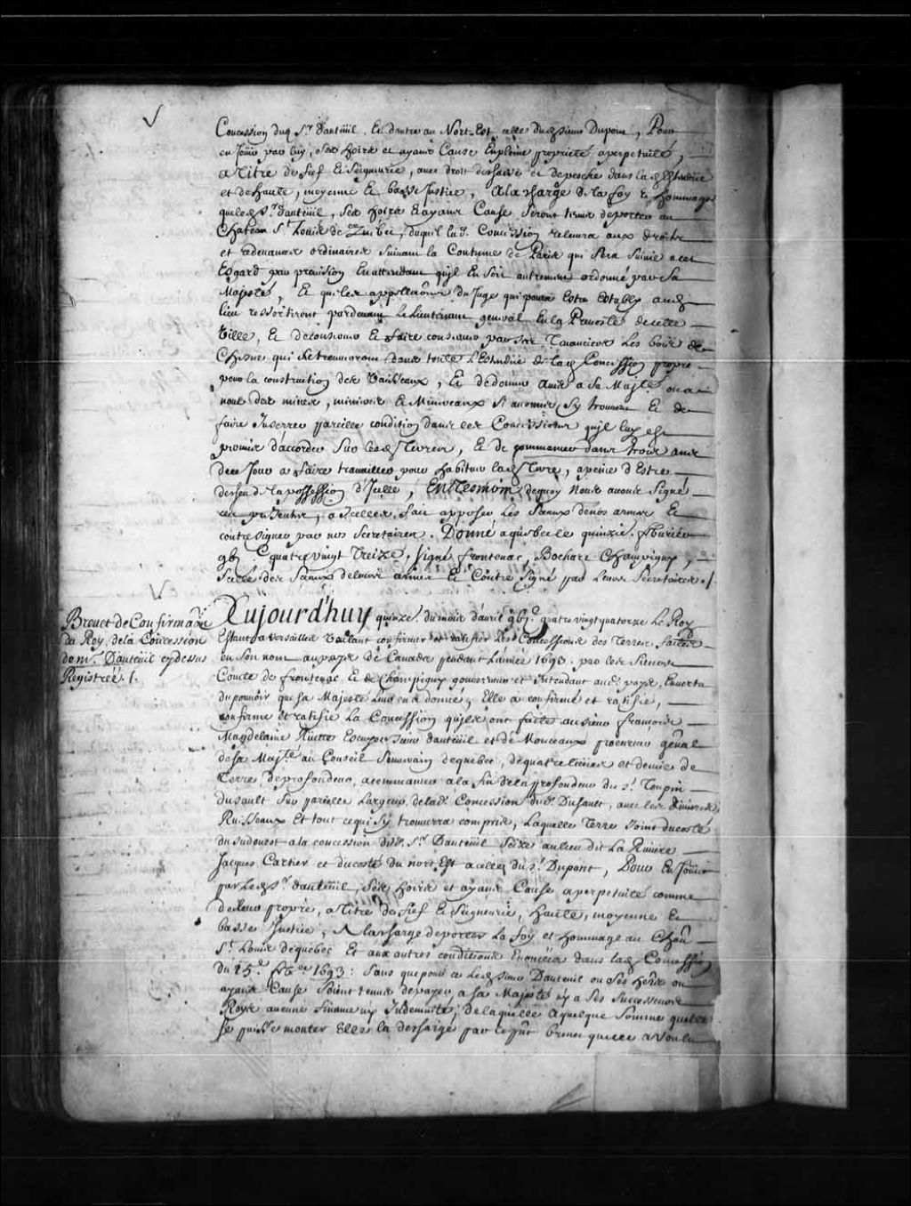 Brevet de confirmation par le Roi en faveur de François-Madeleine Ruette d'Auteuil et de Monceaux de la concession lui ayant été accordée le 15 février 1693 par Louis de Buade, Comte de Frontenac, et Jean Bochart Champigny, gouverneur et intendant de la Nouvelle-France